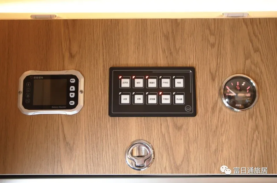 厨房上方左侧,为水电管理控制总成区域,调节管理雪豹1号房车标配的415Ah房车专用电池、3000W充逆变一体机(支持选装太阳能电池板)、100L清水箱、40L灰水箱、8L电控热水器等用水用电设备。