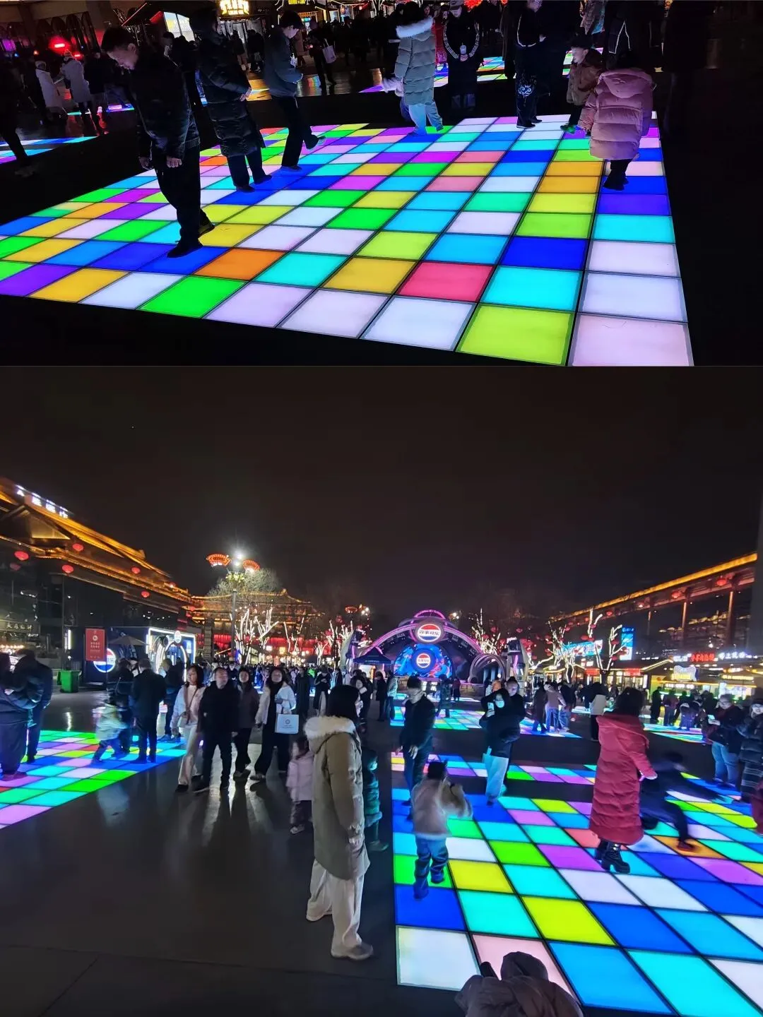 走到步行街中段,彩色的互动地砖吸引了我们。踩上去,地砖就会变换出不同的颜色和图案,女儿像只小兔子一样在上面蹦蹦跳跳,笑声混着周围的音乐,格外热闹。