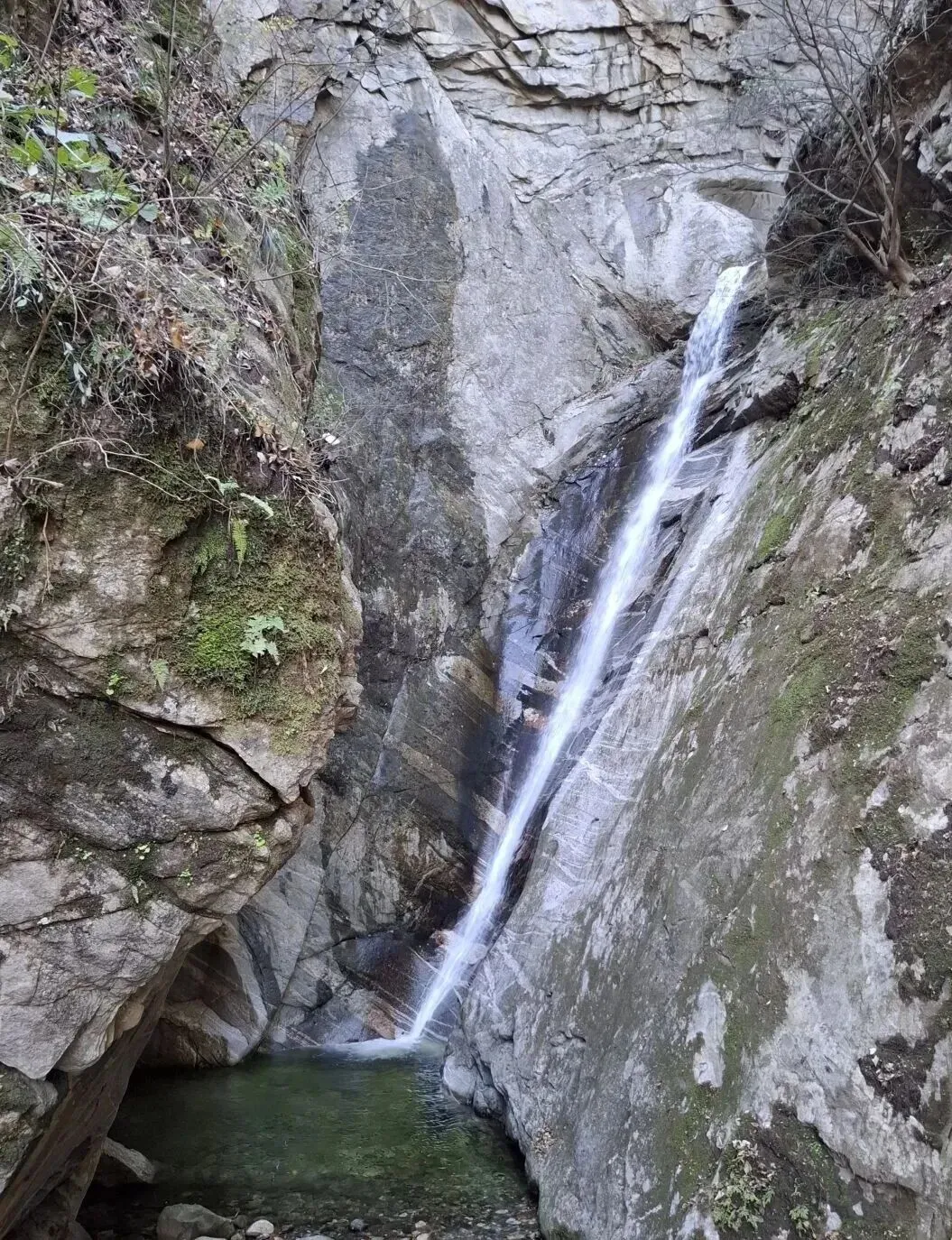 龙口瀑布,处在崖壁夹缝里,一股细流从60米高的崖壁上飞流而下,远处只能见到一线白练挂崖壁上,近处却是水声轰鸣,飞沫扑面,狂妄不羁,令人惊奇。