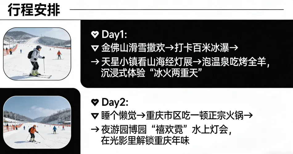 在重庆过春节,怎么能少了雪的仪式感?金佛山冰雪季持续到3月,直接把 “北国风光” 搬来了南国,关键是——还能解锁 “滑雪+温泉+烤全羊” 的一站式快乐!
