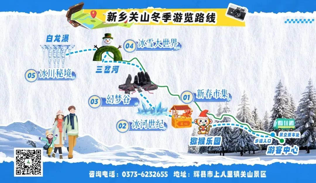 游客中心 → 三岔河 → 白龙瀑(周边打卡关山星野) → 三岔河步道至幻梦谷 → 猴山(观看猕猴表演) → 游客中心 → 地质数字研学馆(科普体验)