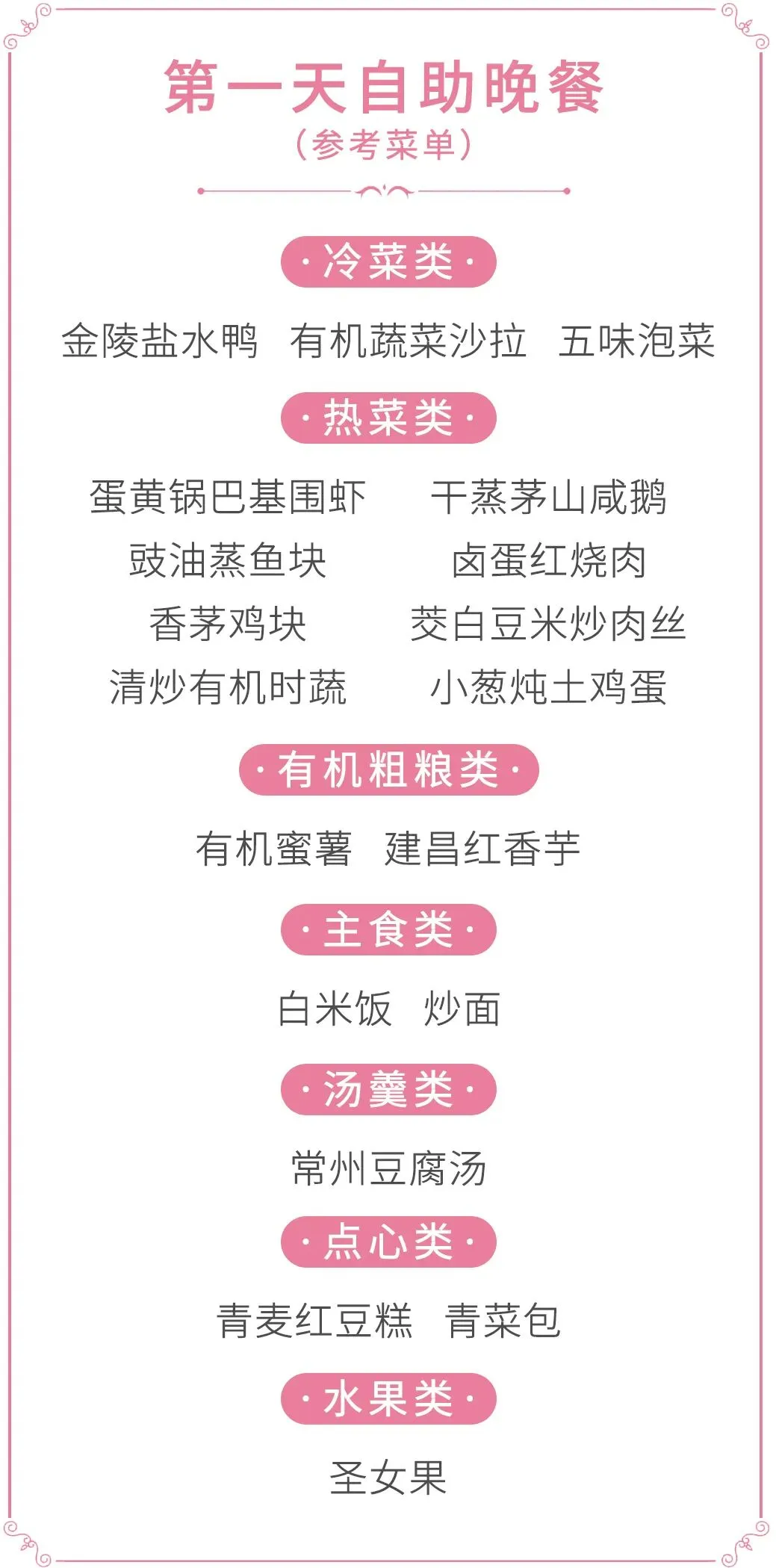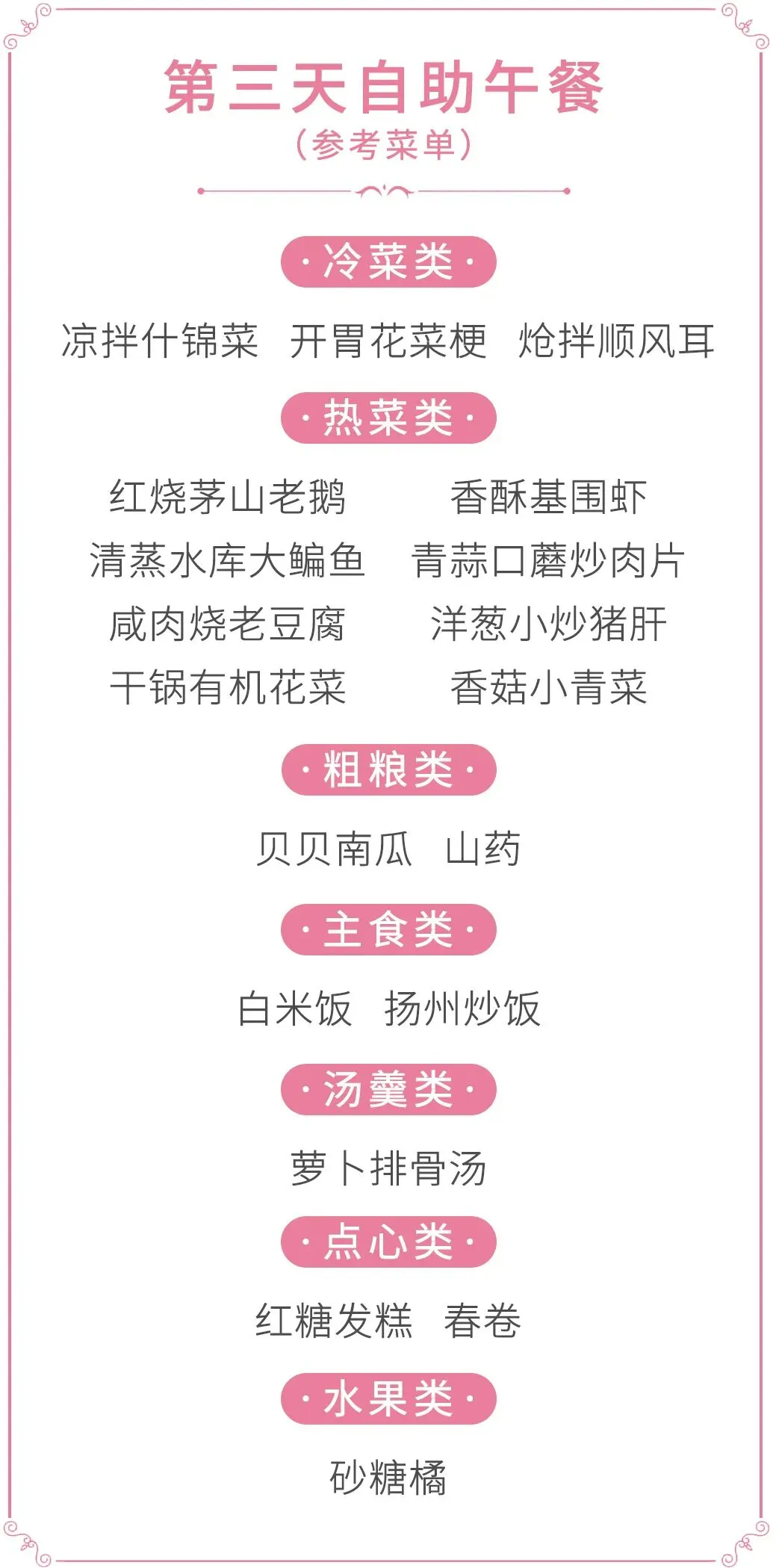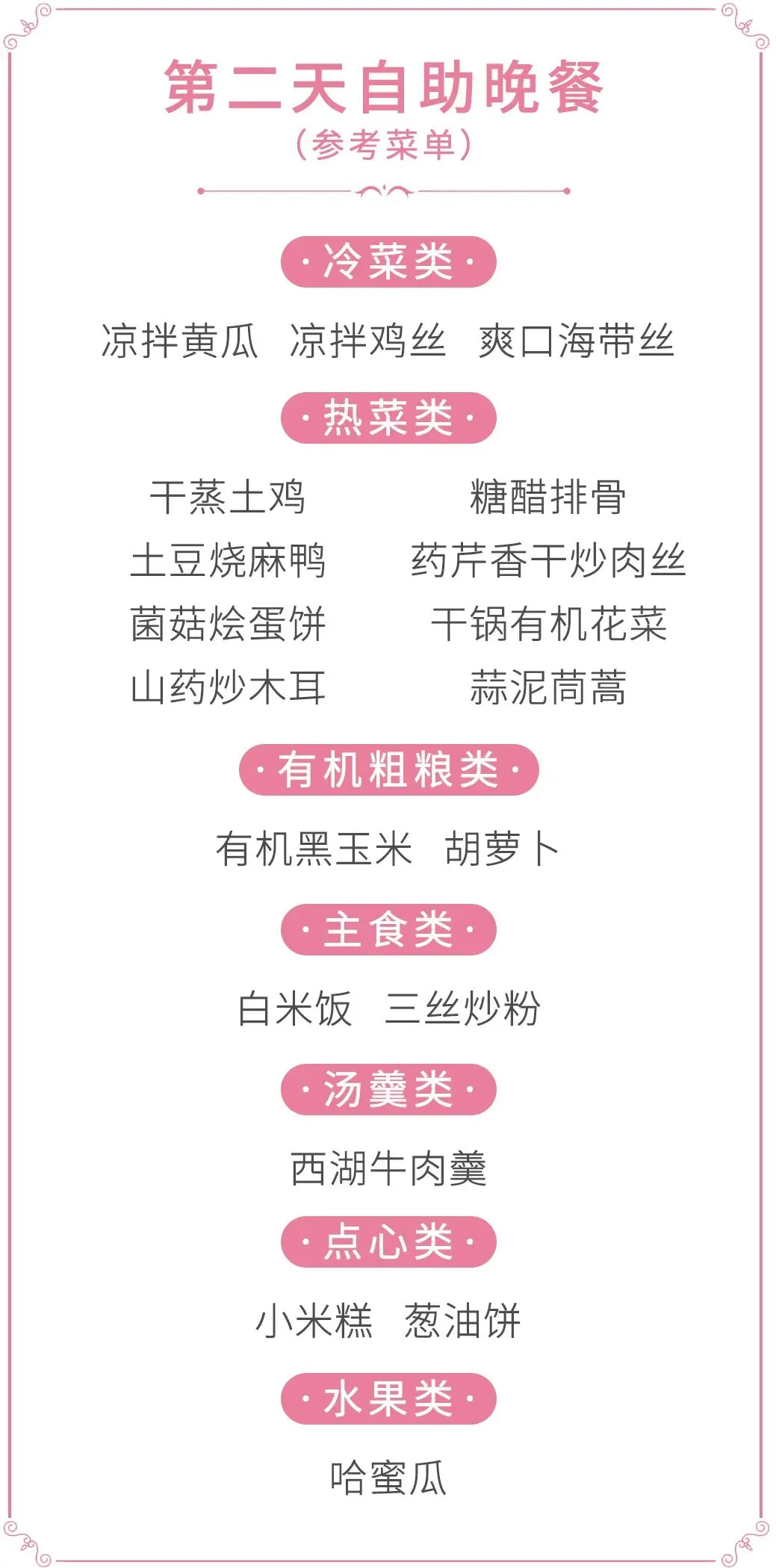 •3顿自助正餐:餐标40元/人,冷菜、热菜、粗粮、点心、水果一站式配齐