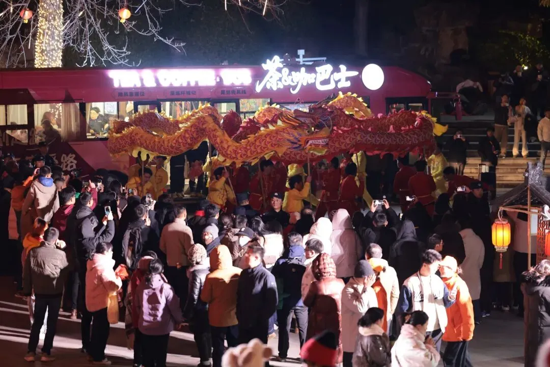 活动现场,舞龙舞狮队伍喧腾贺岁,气势磅礴;鱼灯巡游队伍手持彩灯缓缓穿行,光影流动,唯美动人;憨态可掬的“财神”人偶则穿行于人群中,为市民游客派发吉祥好礼,瞬间点燃了节日的欢腾气氛。 由演员扮演的欧阳修、苏轼“文章太守”NPC组合惊艳亮相,在平山堂前与游客吟诗互动、合影留念。两位宋代文豪“穿越”千年,与市民游客共话扬州风雅,将“平山堂文化”的精神内核演绎得淋漓尽致,成为当晚最受欢迎的打卡亮点之一。