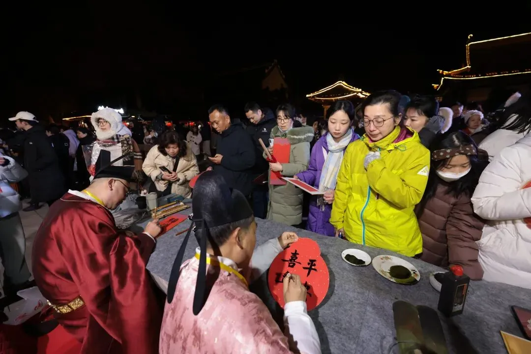 本次祈福活动突破传统模式,以“平山堂文化”为精神内核,巧妙融合文人雅趣与地方民俗,精心设计了“光影璀璨、喜迎新春”“民俗游园、年味拉满”“唐风市集、拾趣非遗”“文章太守、穿越巡游”“文艺荟萃、雅俗共赏”“三钟同鸣、开启新程”“科创赋能、视觉盛宴”“翰墨祈福、寄语新年”等八大板块内容,为游客呈现了一场兼具文化深度与参与乐趣的新春盛典。