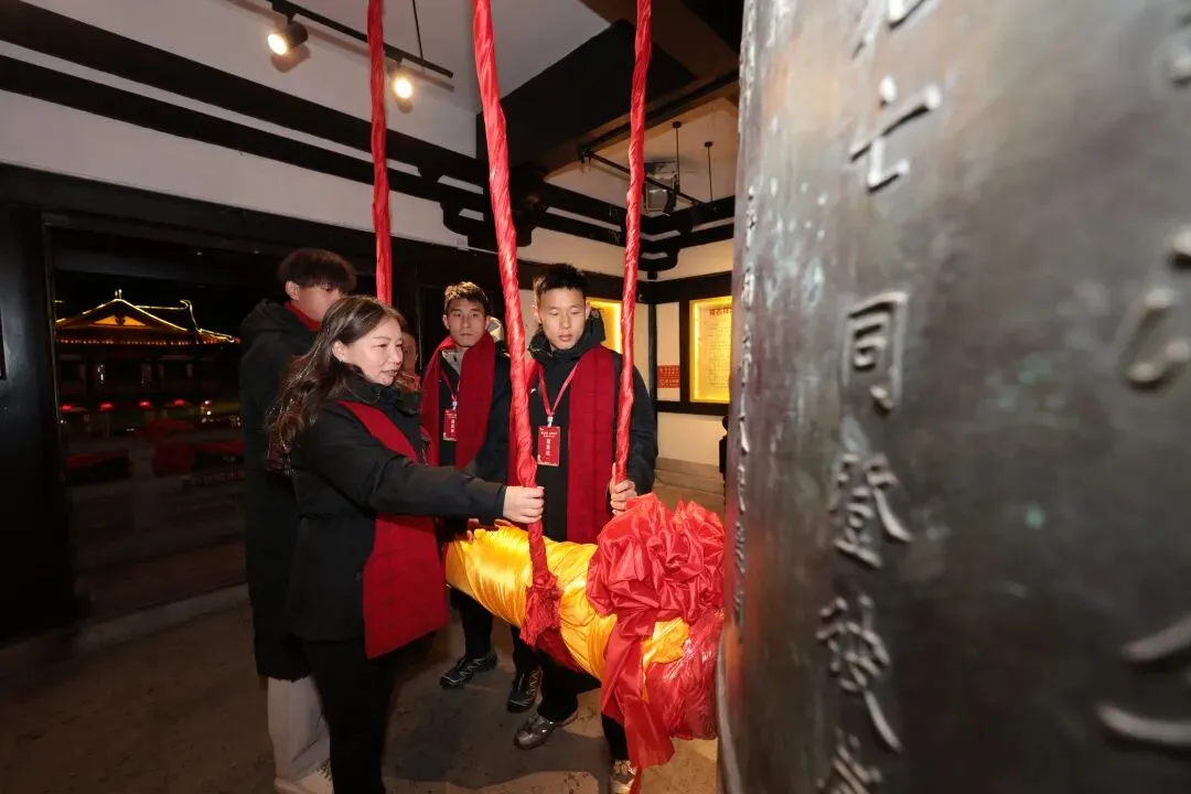 当晚22时58分,“三钟同鸣·辞旧迎新”活动将现场气氛推向高潮。来自扬州及永州的市民游客一同参加活动。参与者中,既有扬州本地的优秀科技工作者、道德模范、劳动模范、医生、教师、文化名人、苏超运动员和留扬过年的企业工人,也有专程而来的永州市民代表。钟声回荡,满载着人们对美好生活的共同期盼。