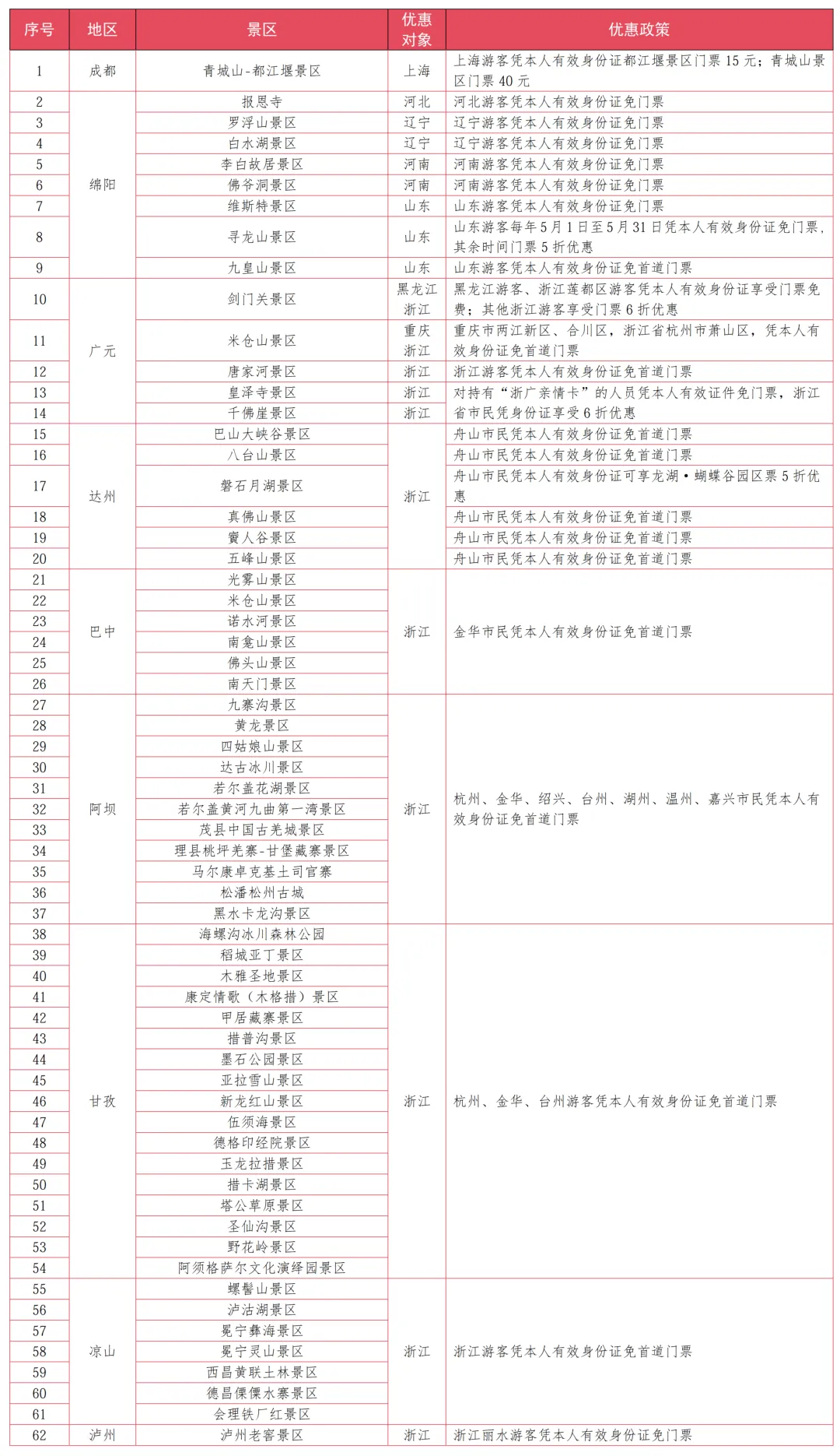 18年感恩如山,四川62家A级景区向援建省市长期减免!