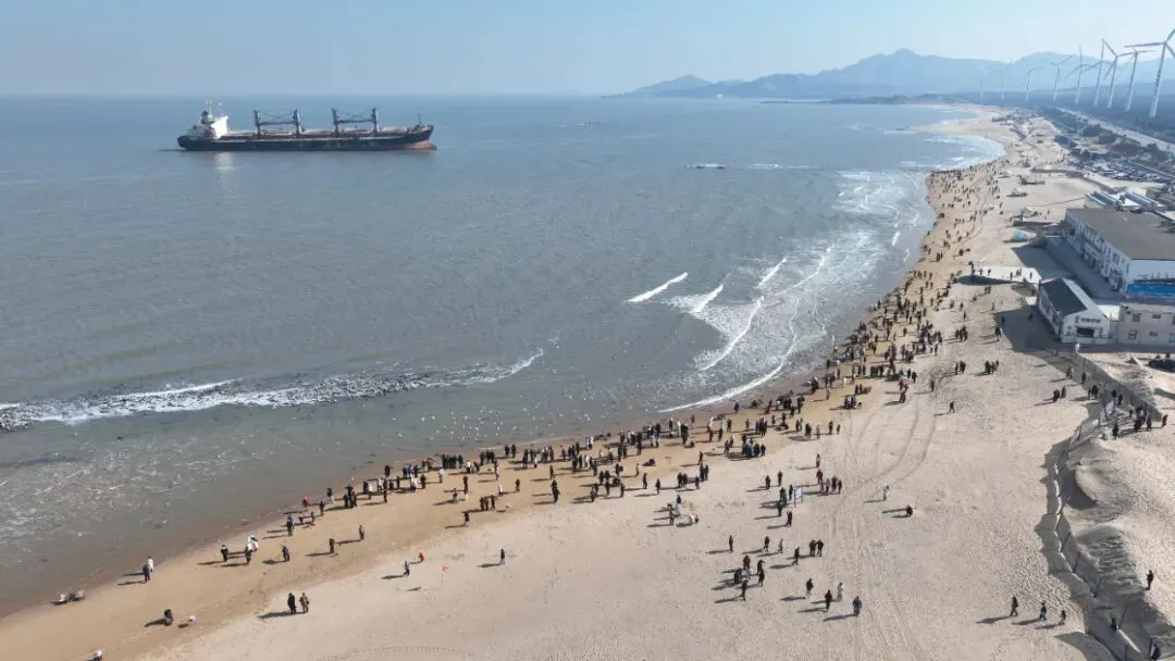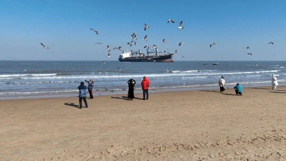 在布鲁威斯号沙滩,徐徐的海风,温暖的太阳,让来这里拍照打卡的游客络绎不绝。层层的海浪,空中翻飞的海鸥与远处的布鲁威斯号,构成一幅美丽的山水画卷,游客们在这里逗海鸥,拍全家福,留下新年的美好期盼。