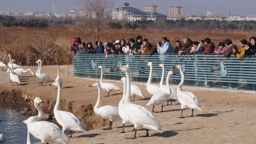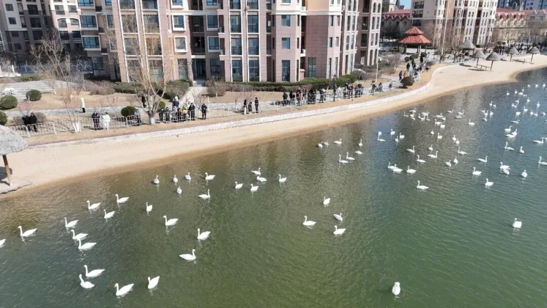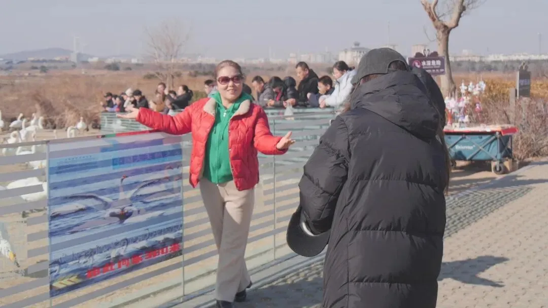 在天鹅湖周边观赏点,人们远道而来,或一家老小集体出游、或亲朋好友结伴而行,观赏天鹅,打卡天鹅湖。天鹅们也仿佛知道佳节的到来,比起往常更加活跃,或游弋湖面,引吭高歌;或凌空翱翔,翩翩起舞,尽展优雅姿态,与周围山水构成一幅唯美的山水画卷。大家纷纷拿出手机、相机与天鹅拍摄合影,保留这特殊的瞬间。