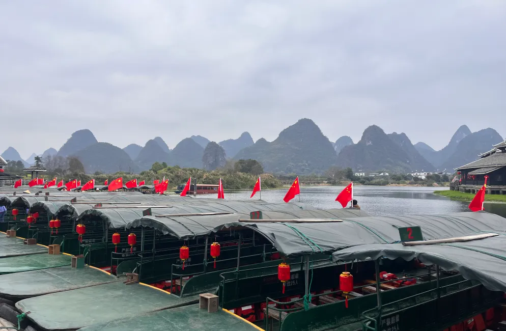 景区内处处张灯结彩,游船上鲜艳的红旗迎风招展,年味扑面而来!