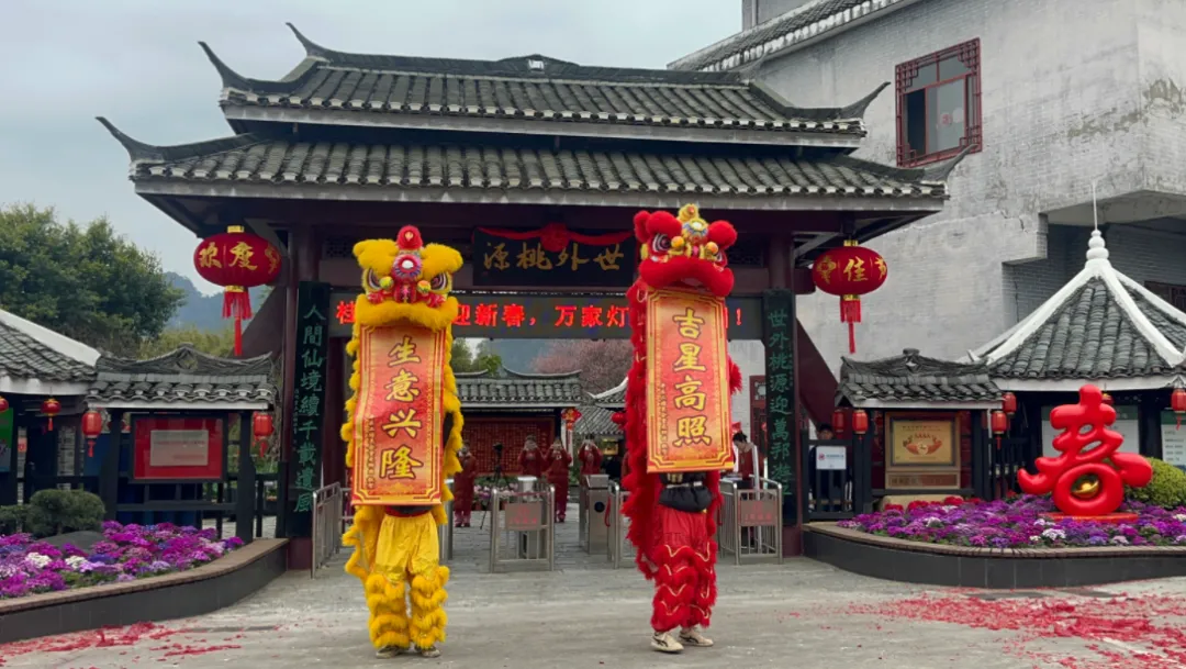 大年初一的世外桃源,锣鼓喧天,热闹非凡!舞狮如约登场,成为景区里最亮眼的风景线。威风凛凛的雄狮踏着铿锵的鼓点,腾跃、翻滚、登高,一举一动都气势十足。