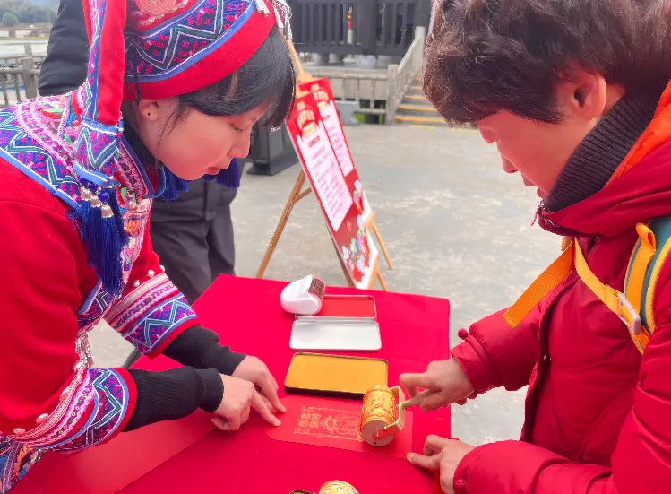 雕版印刷滚轮的趣味体验区里,游客朋友们的参与热情一路高涨。大人小孩纷纷拿起滚轮,在红包上印下马年专属的好运图样,将印好的红包收好,把满满的福运和年味带回家,在动手体验中解锁新年的美好打开方式。
