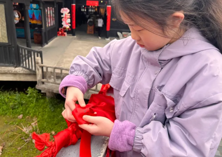 大家将写满心愿的福带系在同心桥上,让微风带着美好祝福飘向远方,红丝带在青山绿水间随风摇曳,成为景区里一道温馨的风景线,游客们在寄寓心愿的过程中,感受着新春的温暖与美好。