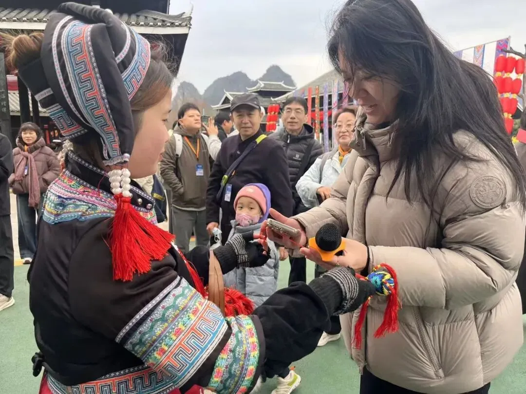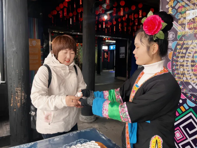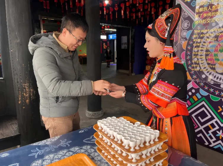 侗族迎宾拦路酒,让每一位踏入景区的游客都感受到了浓浓的民族风情。盛装的侗族姑娘笑靥如花,手捧醇香米酒,用最隆重的礼仪迎接远道而来的客人,游客朋友们欣然接过酒杯,一饮而尽,在甘醇的酒香中,开启新春的美好旅途。