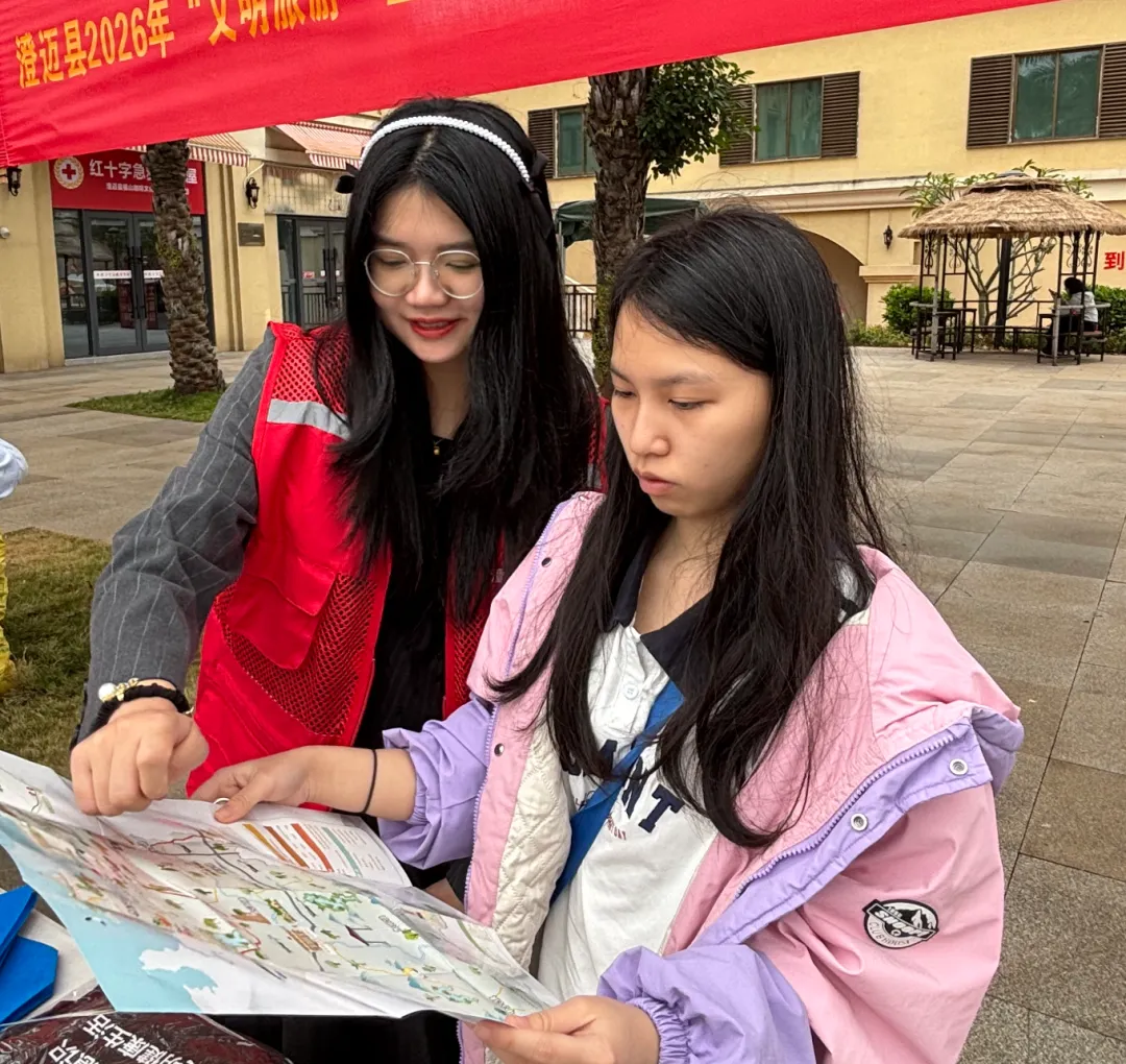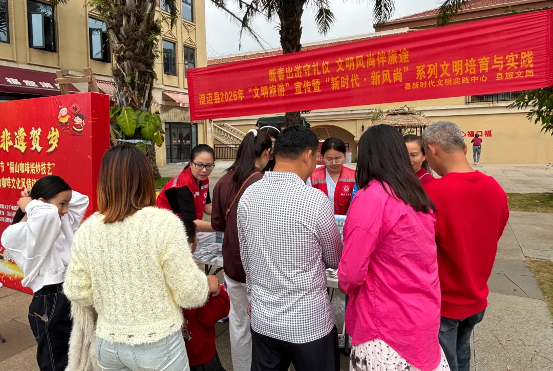 金马贺岁,福地迎春。2月17日,农历大年初一,福山咖啡文化风情镇内游人如织,县新时代文明实践中心联合县旅文局在此举办“文明旅游”宣传暨“新时代·新风尚”系列文明培育与实践活动,为市民游客的新春之旅备上了一份特别的“文明行囊”。 活动现场,一抹抹“志愿红”成为亮丽的风景线。志愿者们热情洋溢,向往来游客和市民发放精心制作的《澄迈旅游手绘地图》《澄迈旅游指南》等宣传资料。他们不仅是资料的发放者,更是文明出行的“讲解员”,耐心细致地为大家讲解外出旅游时的注意事项,积极引导大家恪守社会公德、爱护景区环境、做到文明游览。