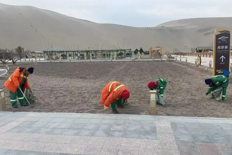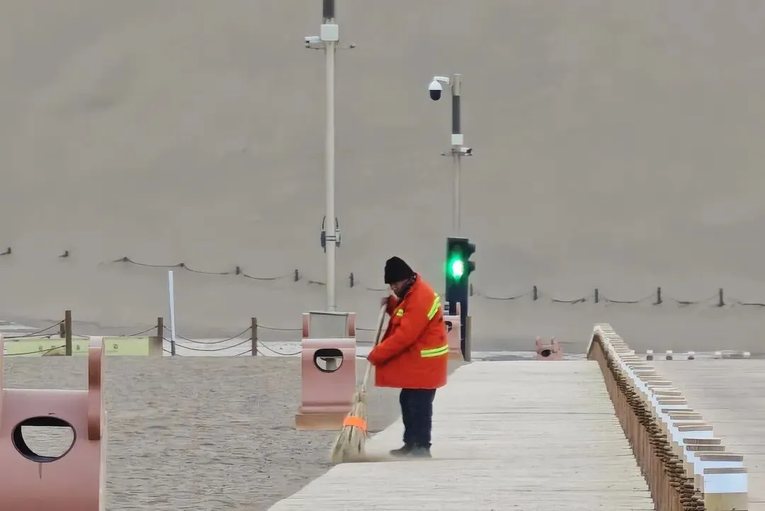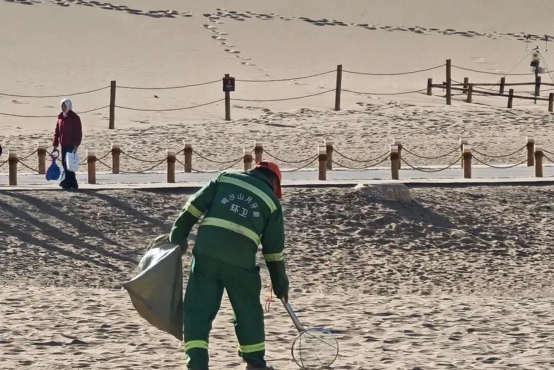 清晨6点多,大多数人还在睡梦中,身着橙色工作服的保洁员身影已经开始了一天的工作,在绵延的沙丘上、蜿蜒的栈道边、月牙泉的围栏旁,总能看到他们的身影。他们手持特制的长夹和垃圾桶,在起伏的沙脊间深一脚浅一脚地行走,不断俯身捡拾。“沙子灌进鞋里是常事,半天就得倒一次。”保洁员王叔笑着说,“但看着景区干干净净,游客拍照时背景清清爽爽,心里就高兴。这可是咱们敦煌的脸面。”