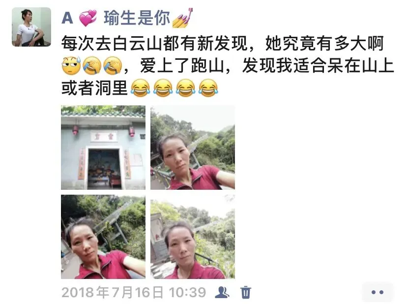 除了瑜伽,每周两到三次跑步也少不了,晚上不加班时,回来跑步,周末休息去跑步,从第一次跑步跑不了30秒,到后来一年左右跑下白云山。