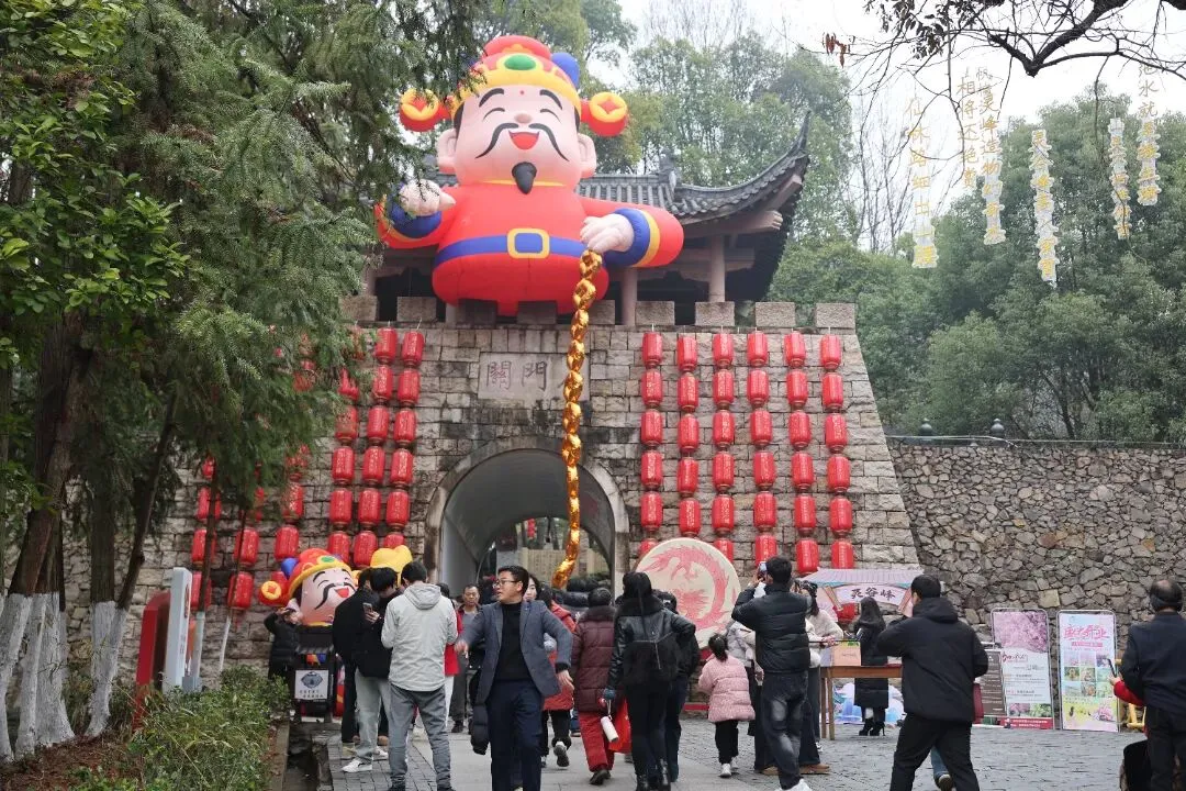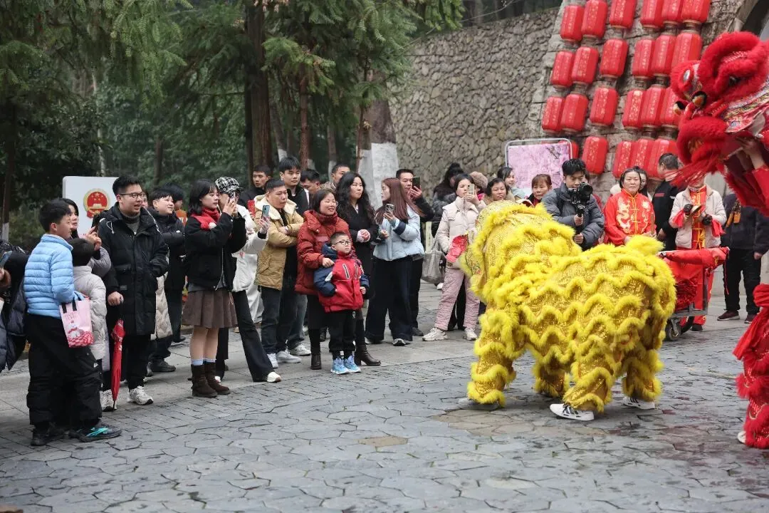 石门关前,舞龙舞狮迎春巡游率先登场,锣鼓喧天、彩绸翻飞,金狮红狮腾跃翻转,引得游客纷纷驻足拍照,快门声与喝彩声此起彼伏。