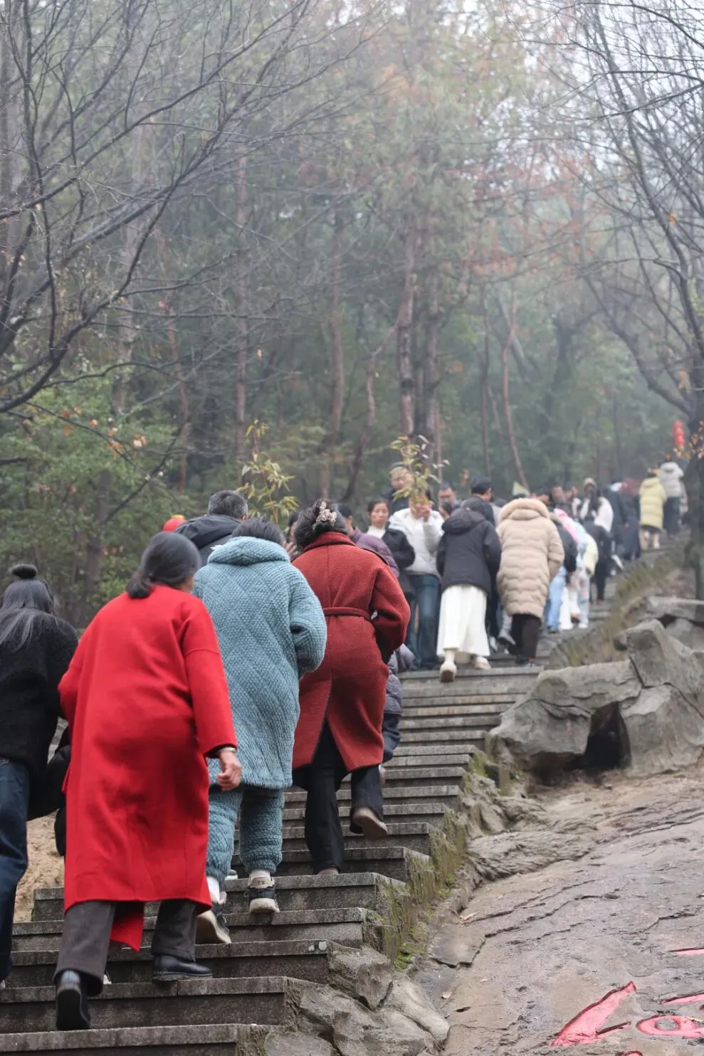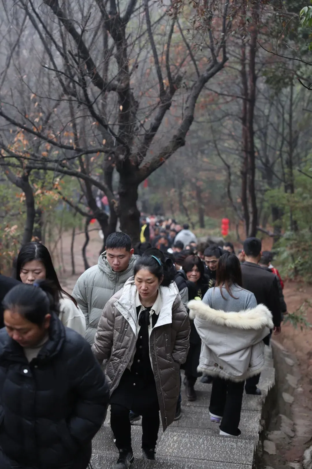 登山步道上,游客络绎不绝,扶老携幼拾级而上,山间的红灯笼与人群的欢声笑语交织,成为新春里最动人的风景。