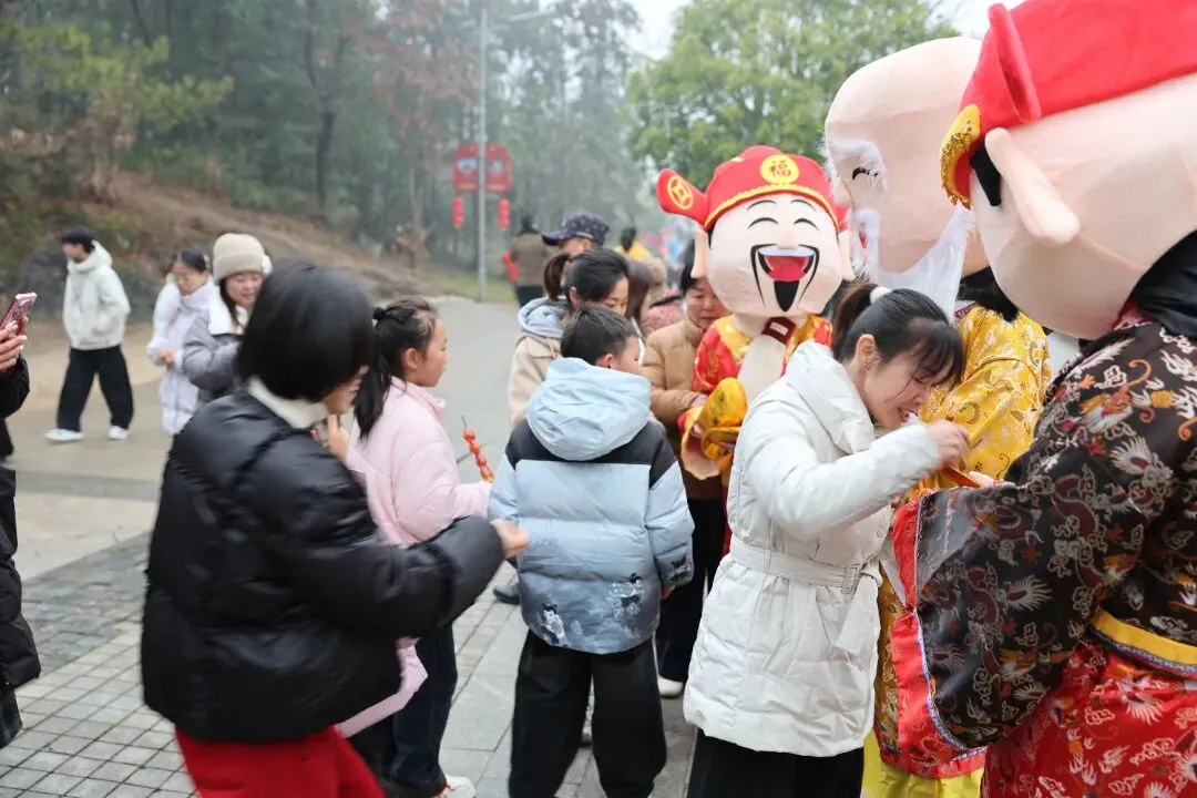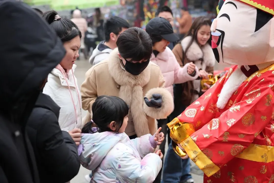 “福禄寿和财神”NPC沿主路线巡游送福,与游客热情互动,送上马年吉祥祝福,不少游客争相合影,领取糖果,把新年好彩头带回家。