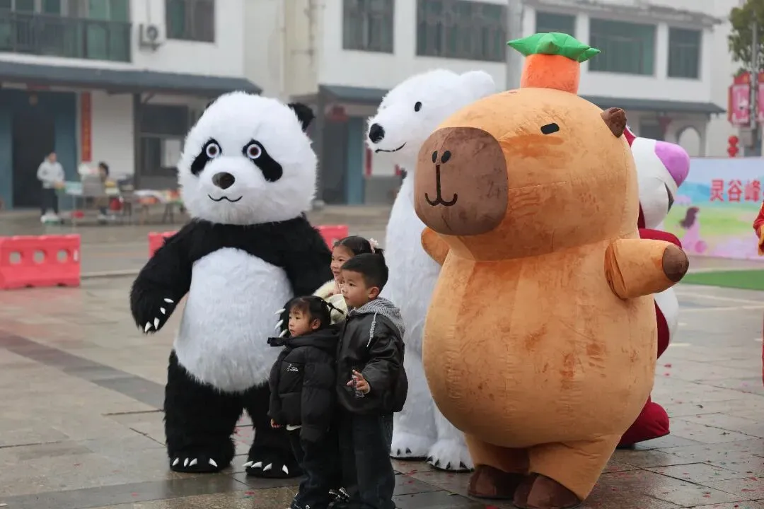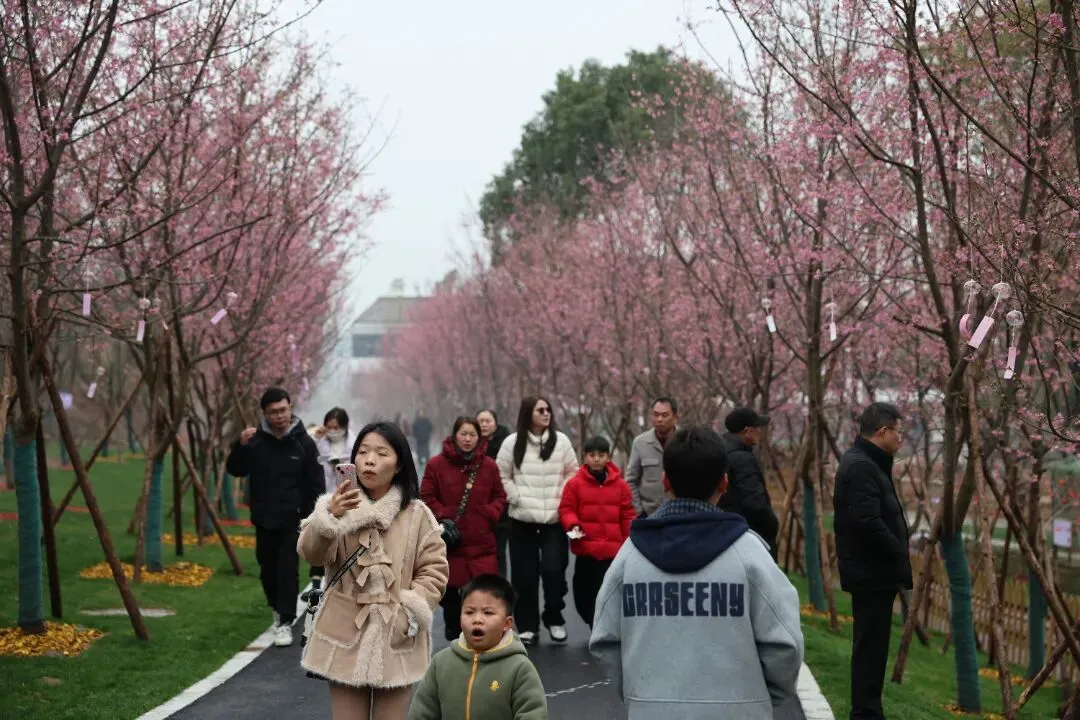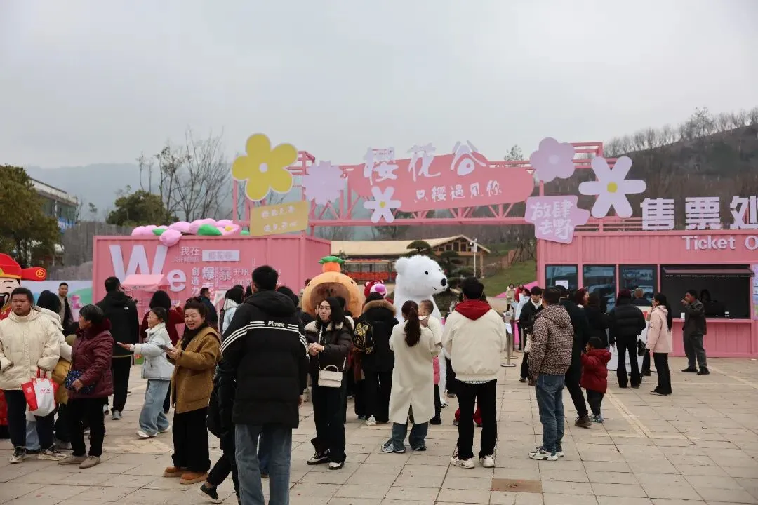 樱花谷内,早樱渐次绽放,粉黛如烟,与新春盛景相映成趣。樱花主题玩偶巡游热闹开跑,哭哭马、大熊猫、北极熊等萌趣玩偶穿梭其间,与小朋友握手、拥抱,现场笑声不断。