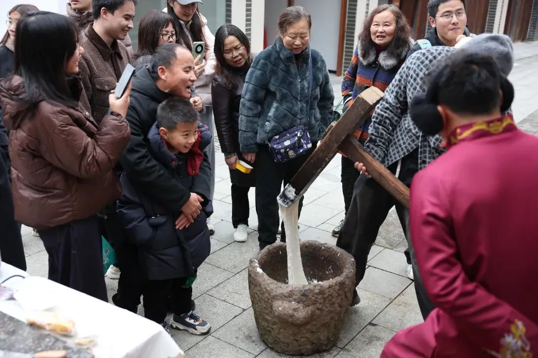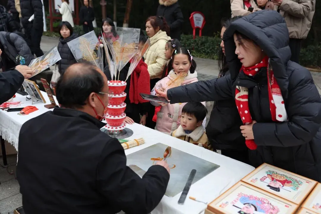 庙街非遗展区人气爆棚,铝编、糖画、打麻糍等抚州特色非遗项目齐聚,传承人现场展演教学,游客们围在摊位前,体验打麻糍的乐趣,把非遗年味带回家。
