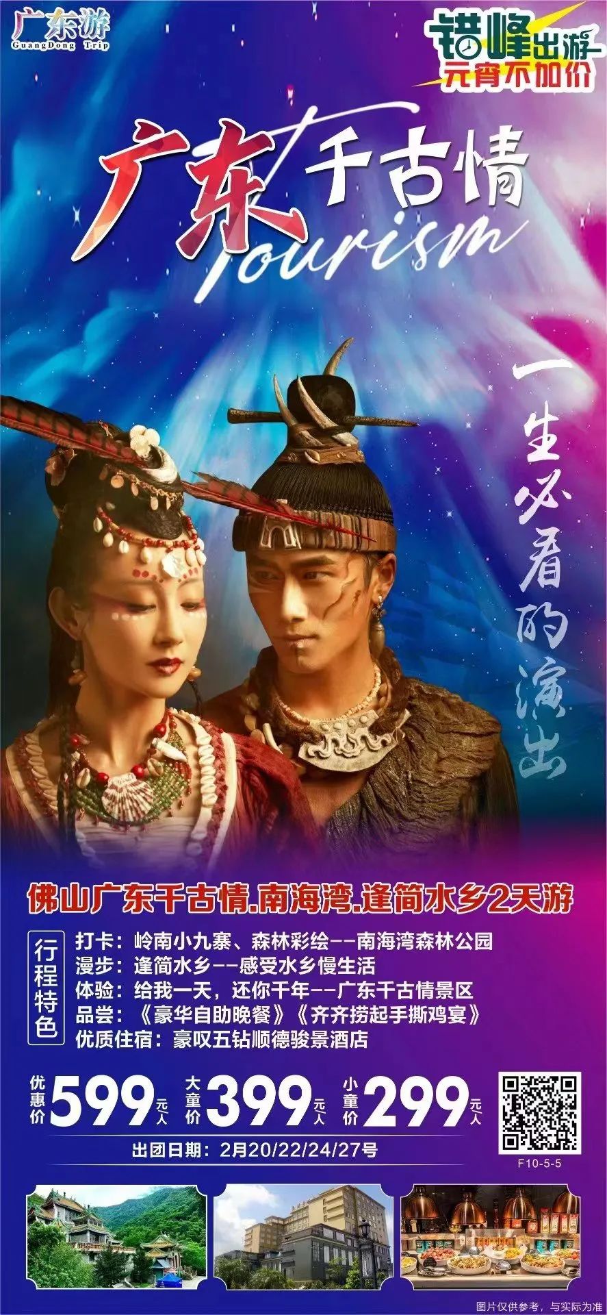 给我一天、还你千年,体验波澜壮阔民族风情-广东千古情、打卡【岭南小九寨、森林彩绘--南海湾森林公园】、漫步【逢简水乡--感受水乡慢生活】、入住骏景酒店2日游