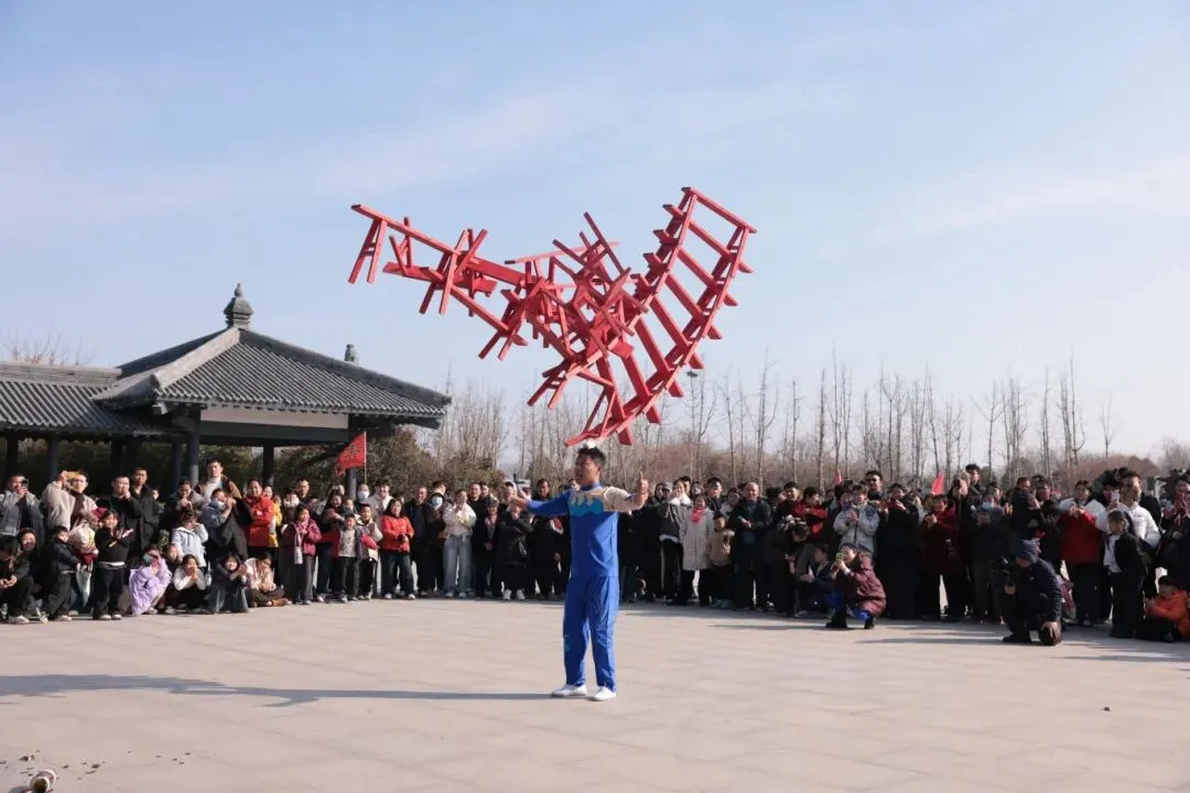 崇祖门前的杂技大联欢引来阵阵喝彩。《顶碗》《走钢丝》《蹬技》等经典节目轮番上演,惊险处全场屏息,精彩处掌声雷动。不远处的虹栖桥南,《礼仪之邦》《相和歌》等汉舞翩然上演,舞者们广袖长舒,衣袂飘飘,与桥畔摇曳的祈福牌相映成趣。