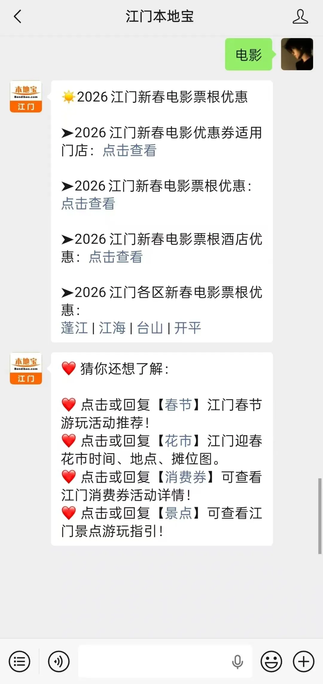 在微信聊天对话界面回复【电影】