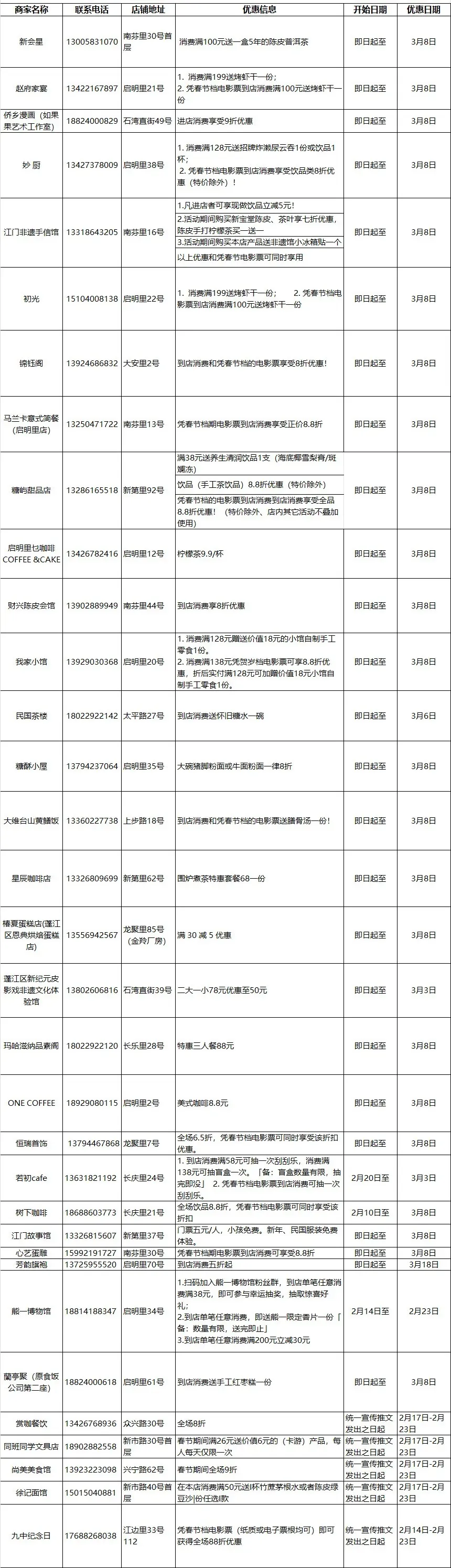 春节档期间(2月14日—2月23日),凭任意春节档电影票(纸质或电子票根),即可在江门多个景点、商圈、酒店民宿享受消费优惠,还有多重福利与精美礼品