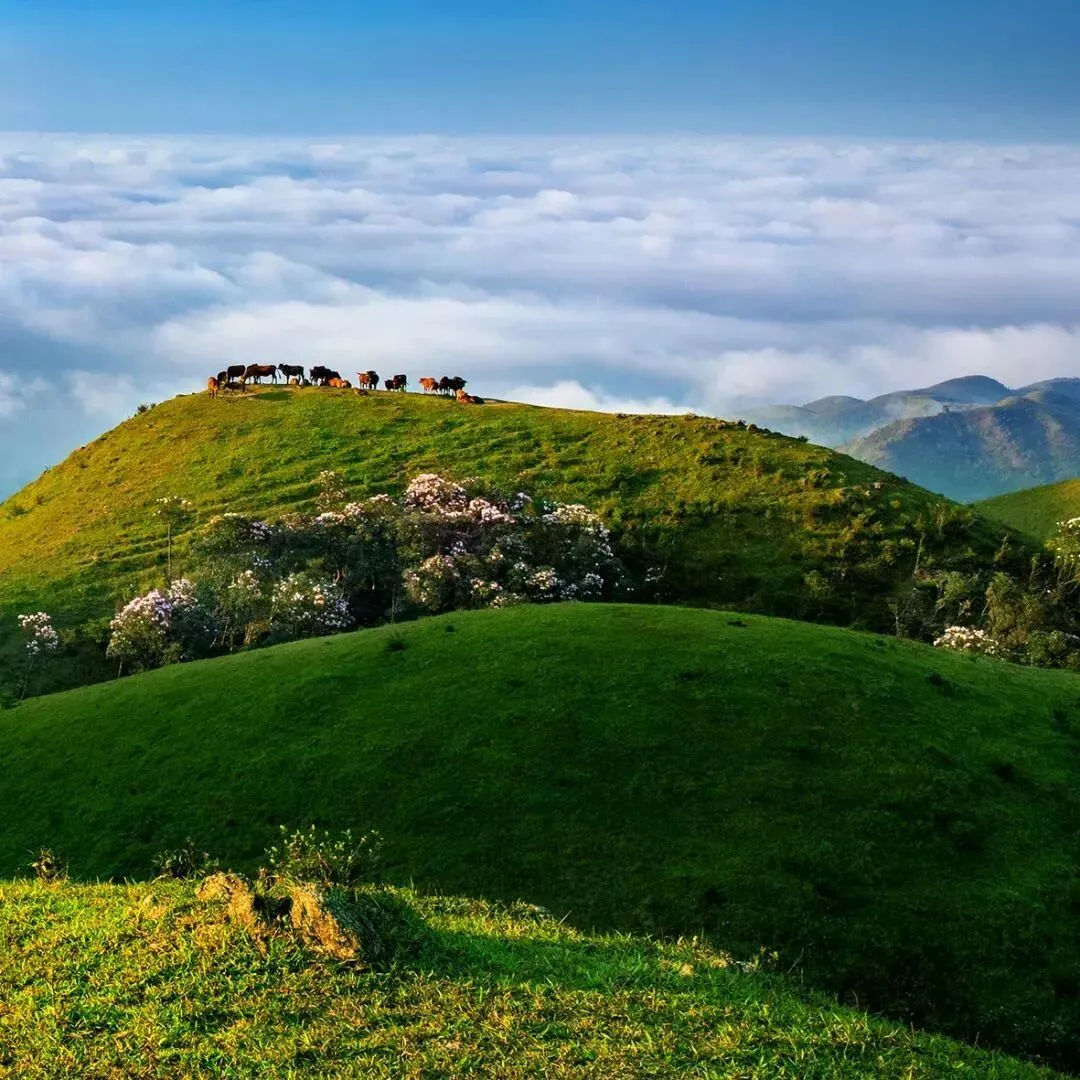 鸡笼顶高山草甸是粤西最大的草原, 海拔1280.5米, 灌木林与草地泾渭分明, 山脊全部长着厚厚硬实实的一层草皮, 最高的草不超过20公分, 鸡笼顶山也是阳江第二高峰, 来到这里的人没有一个不被它惊叹!
