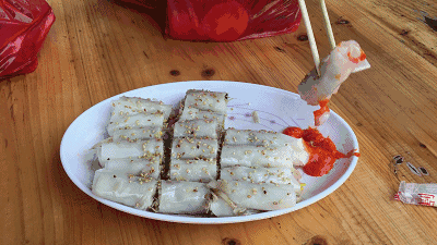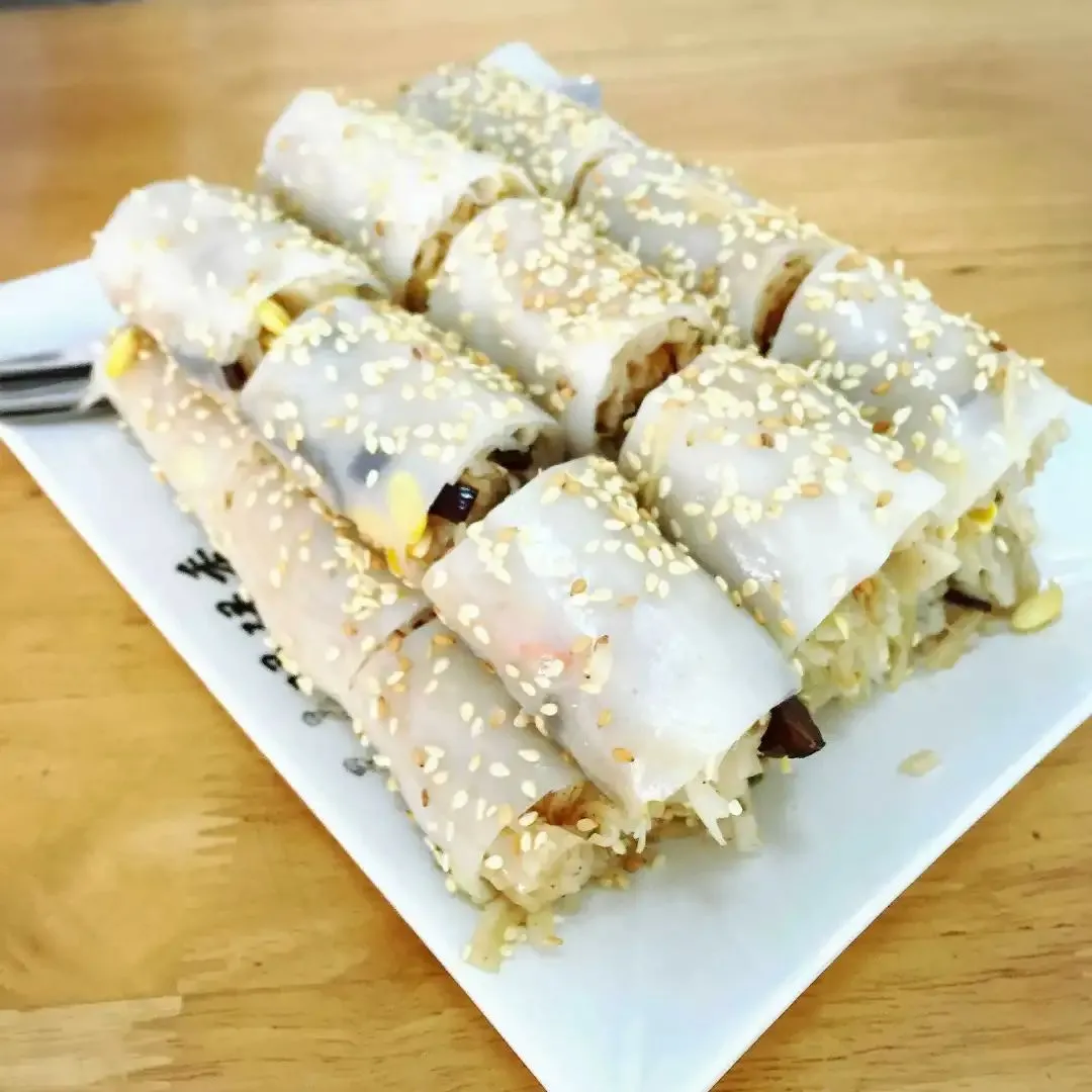 猪肠碌是没有阳江人不知道的小吃,它外形和平时吃的粉卷相似,用米粉皮包着豆芽、虾皮、炒河粉和蛋皮等食材,再在河粉皮上撒上芝麻即可。