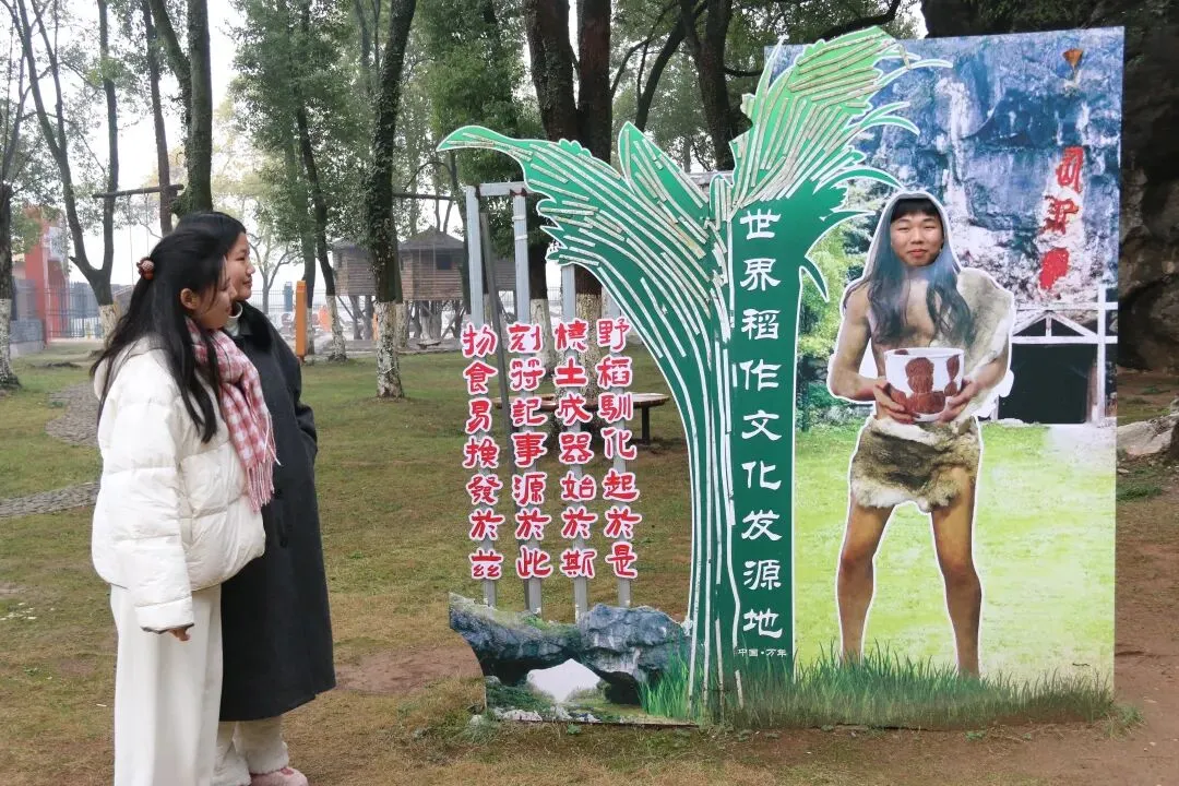 在仙人洞-吊桶环遗址,前来参观的游客也络绎不绝。不少游客在游玩时,不忘来个Pose,发发朋友圈,告诉全世界,大年初一来到世界稻作文化起源地探秘,和原始“先民”合了影。来自乐平的游客万先生带着家人参观后说,“万年县仙人洞遗址发现了距今两万年前的陶罐和一万两千多年前的驯化稻植硅石标本,证明了这里就是世界陶文化和稻作文化的起源地。作为邻县的市民,也为万年县仙人洞的伟大考古发现而感到自豪。”
