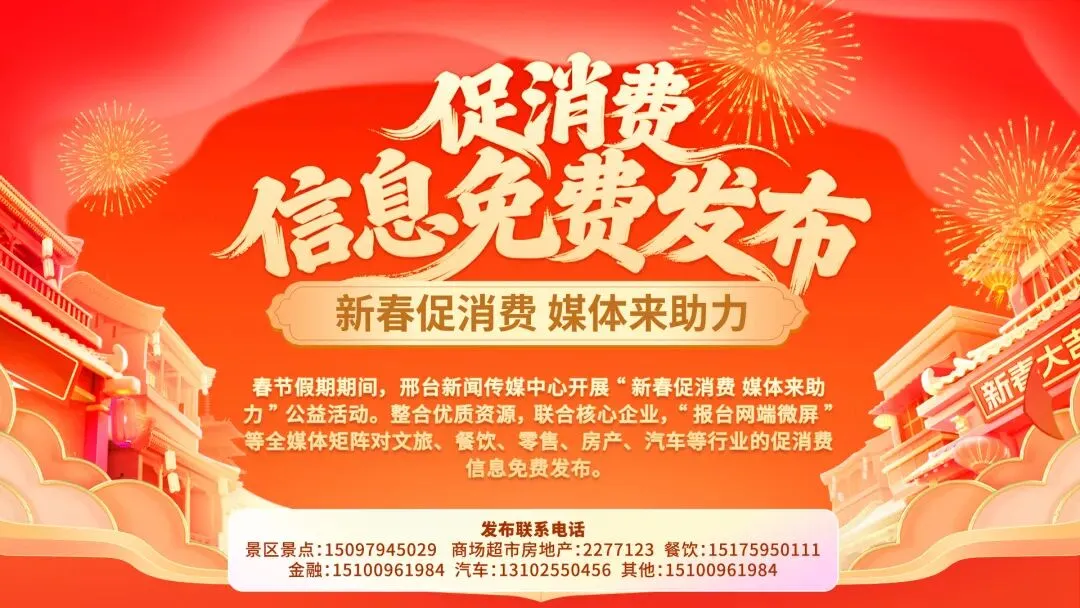 马年新春,为深入贯彻我市促消费工作部署,进一步激发节日市场活力,邢台新闻传媒中心推出“新春促消费 媒体来助力”免费发布服务,充分发挥主流媒体传播优势,全平台发布优惠资讯,为节日市场注入活力。