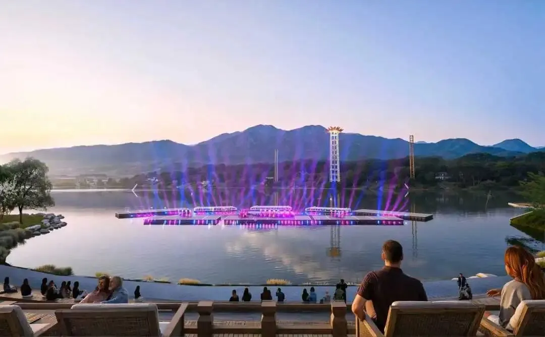 • 雁荡仙踪实景剧场:项目创新设计三种观演体验→船上就近观影、岸上平视观影以及VIP看台全景观影,打造中国首个跨度超过250米的跨江3D威亚表演和40米高莲花水幕塔。融合雁荡山历史传说、山水风光和文化演出,为游客提供震撼的视听体验和文化盛宴。