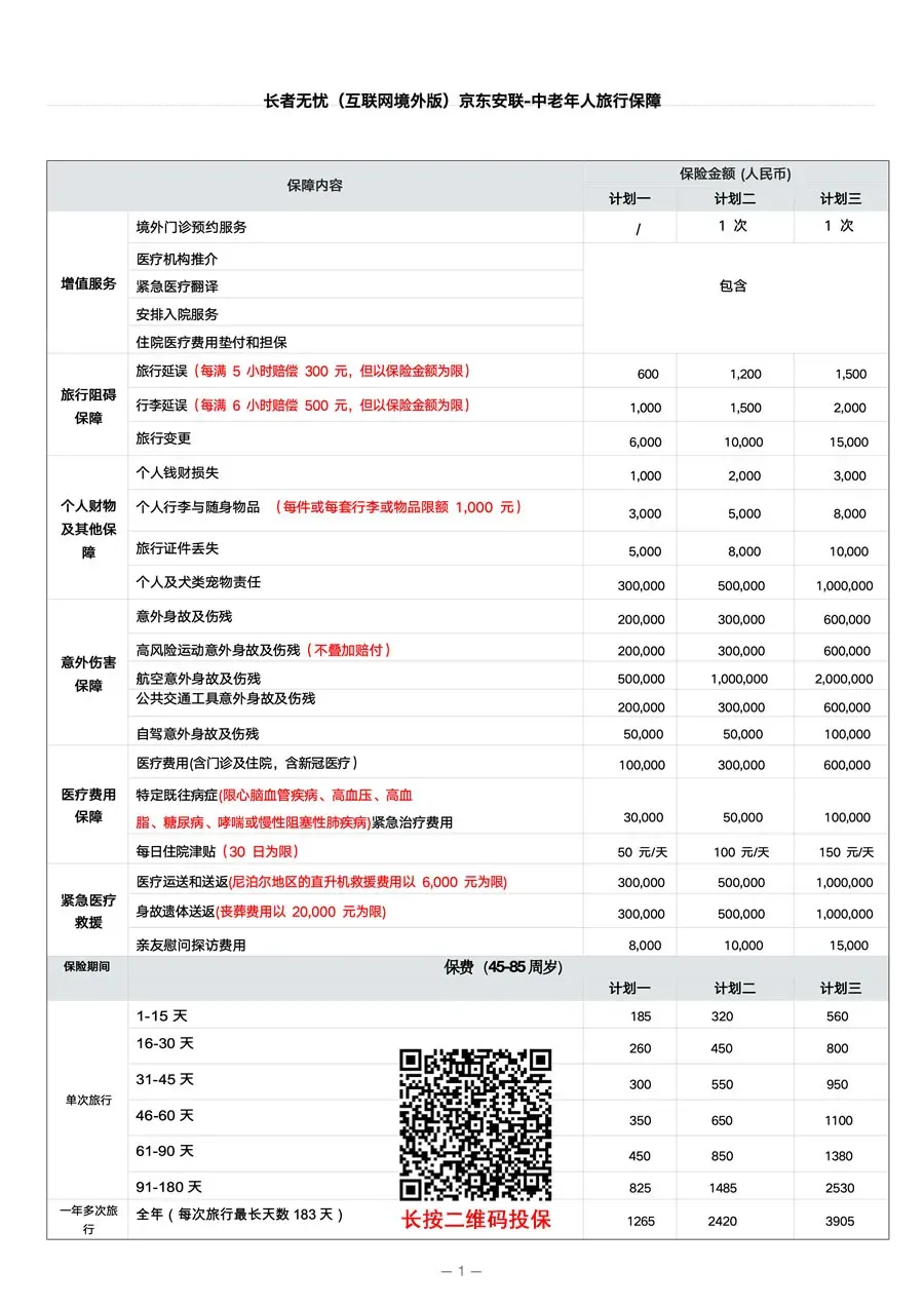 45-85岁,个人/企业,可团单,保期1天最长1年(单次最长183天),6大高发既往病症可投保,计划二三满足申根签证要求,涵盖航班延误、行李延误、旅行变更、个人钱财损失、个人行李与随身物品、旅行证件丢失、个人及犬类宠物责任、高风险运动身故伤残、意外身故伤残、公共交通工具身故伤残、航空身故伤残、自驾身故伤残、医疗费用、特定既往病症紧急医疗费用、每日住院津贴、紧急救援。支持护照、港澳通行证、外国人永久居留身份证、台湾往来大陆通行证等。