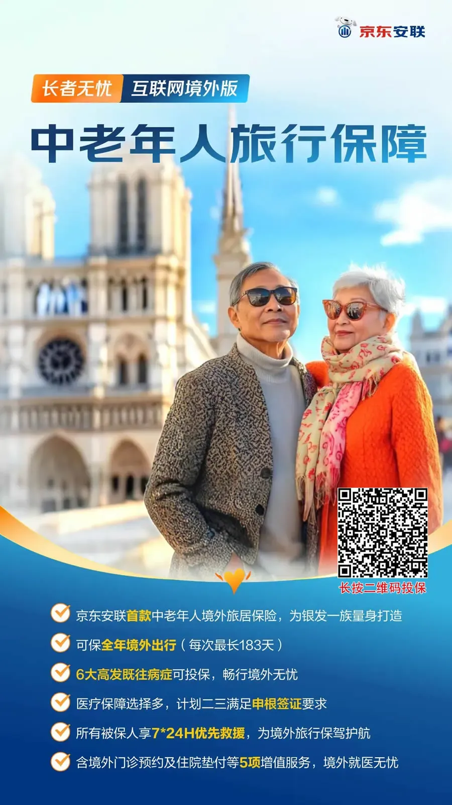 京东安联长者无忧境外旅游险:6大高发既往病症可保,覆盖高风险运动/航班延误/行李延误/紧急救援/财产损失/三者责任/三者责任