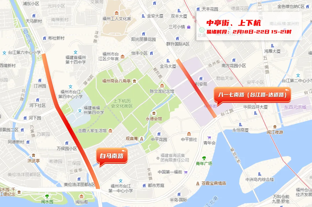 易堵路段为八一七南路(台江路-达道路)、白马南路,易堵时段为2月18日-22日15-21时,高峰通行速度预计为20公里/小时,预计拥堵状态为严重拥堵。