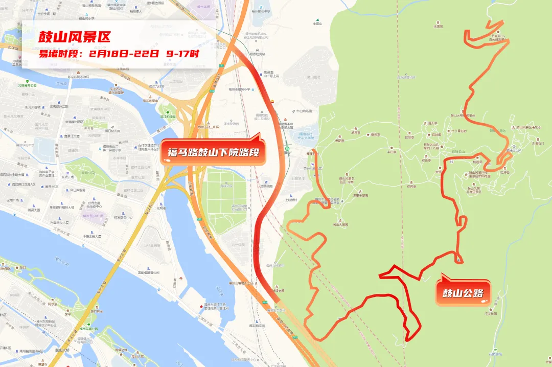易堵路段为福马路鼓山下院路段、鼓山公路,易堵时段为2月18日-22日9-17时,高峰通行速度预计为20公里/小时,预计拥堵状态为严重拥堵。