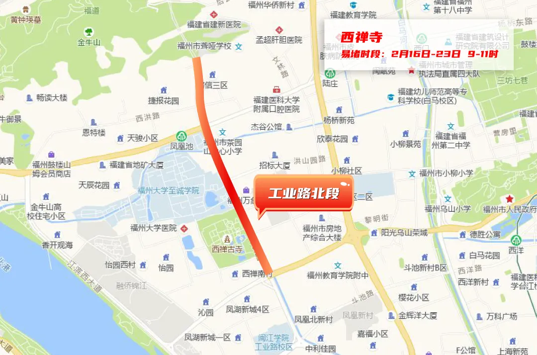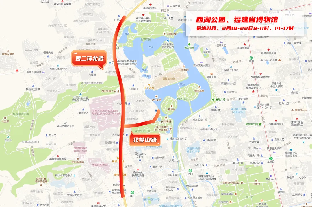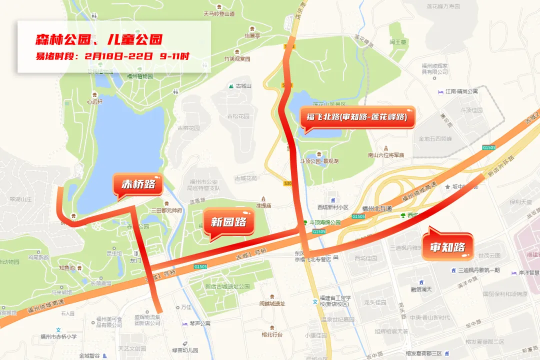 易堵路段为福飞北路(审知路-莲花峰路)、审知路、新园路、赤桥路,易堵时段为2月18日-22日9-11时,高峰通行速度预计为20公里/小时,预计拥堵状态为严重拥堵。福飞北路拥堵时,易发生交通事故,请大家途经时注意控制车速,保持车距,谨慎驾驶。