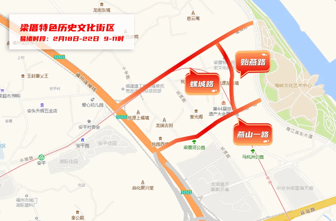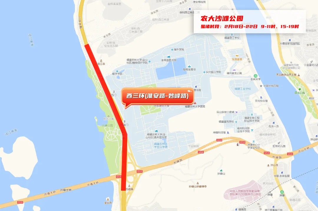 易堵路段为南江滨大道(鼓山大桥-南社一路),易堵时段为2月18日-22日9-11时、15-17时,高峰通行速度预计为40公里/小时,预计拥堵状态为严重拥堵。