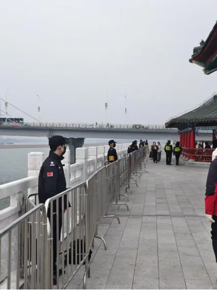 聚焦安保防控关键环节、紧盯核心点位,对滕王阁主楼、沿江观景平台等12处核心区域开展系统性安全评估与设施全面排查,对排查发现的隐患问题坚持立行立改、闭环管理,坚决守住安全底线、杜绝安全漏洞。景区统筹调配安保力量300余人,严格按照“关键点位每5米一人”标准,实现园区全域网格化、高密度值守全覆盖;联动公安、消防、医疗等相关职能部门设立联合指挥中心,实行“分时段、分区域”动态管控机制,依托智慧监控系统对人流密度进行实时监测、精准研判、科学疏导,全力防范人员拥堵及各类安全事故发生。