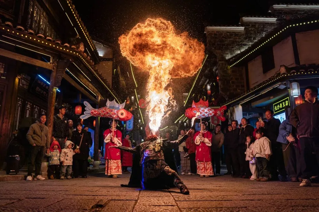 非遗快闪轮番上演,零距离解锁文化魅力。英歌舞、傩戏氛围感拉满,变脸吐火惊艳全场,火舞、打铁花共同点亮夜空。