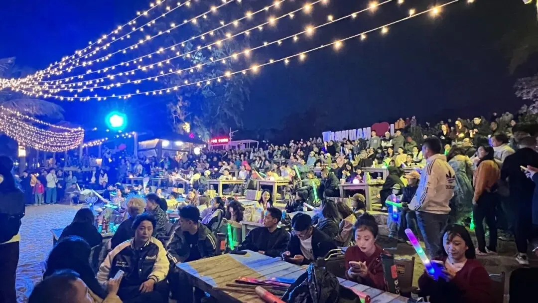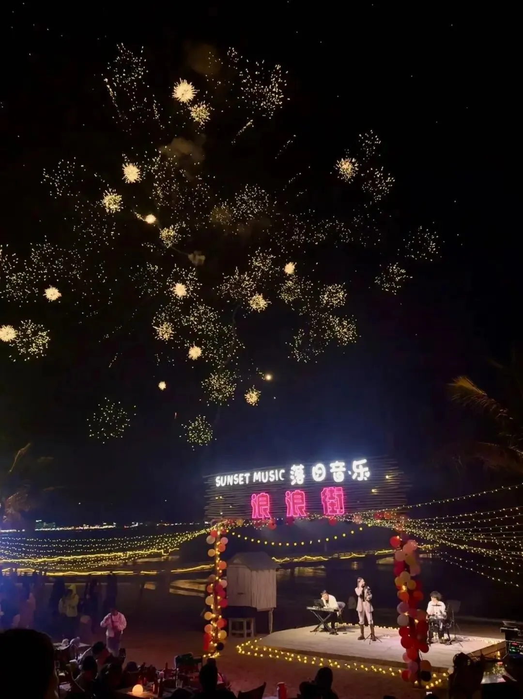 国潮电音夜夜狂欢,全家共享欢乐时光。国潮乐队混搭炫酷电音,舞台热浪持续输出,熟悉的歌声响起全场一起大合唱,大朋友小朋友在沙滩上撒欢蹦跳,感受新春热闹。