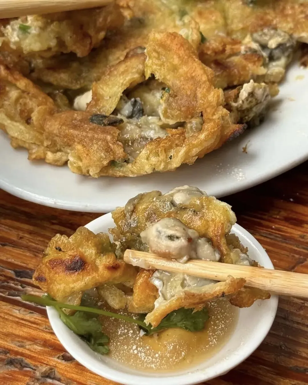鲜蚝裹粉煎至金黄,外酥里嫩,蘸上鱼露,满口都是潮汕海味鲜香。