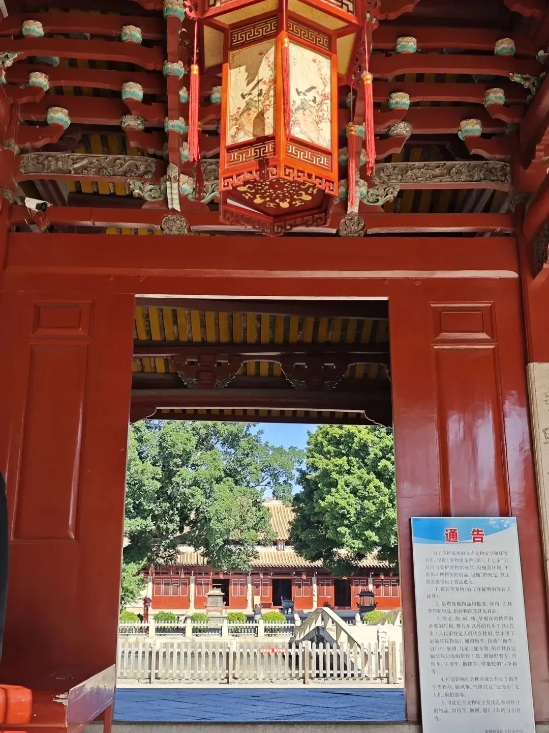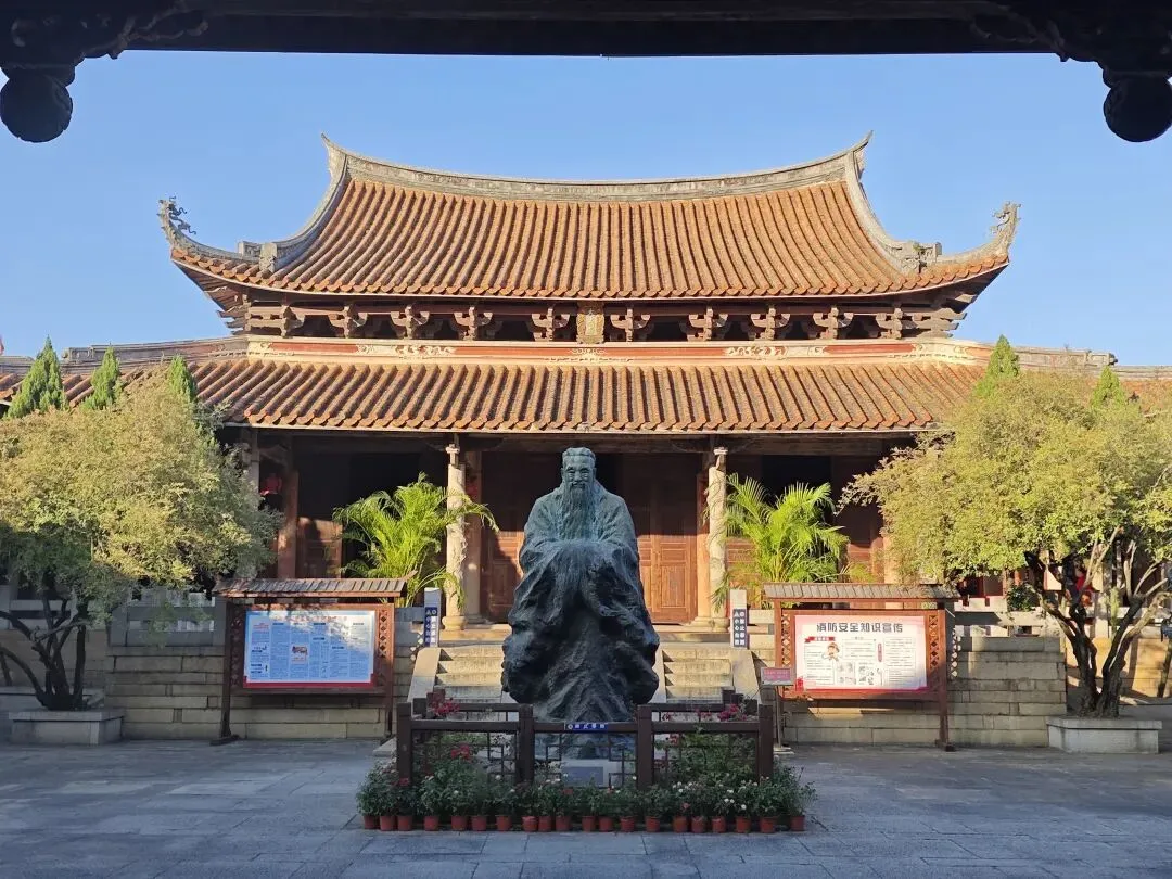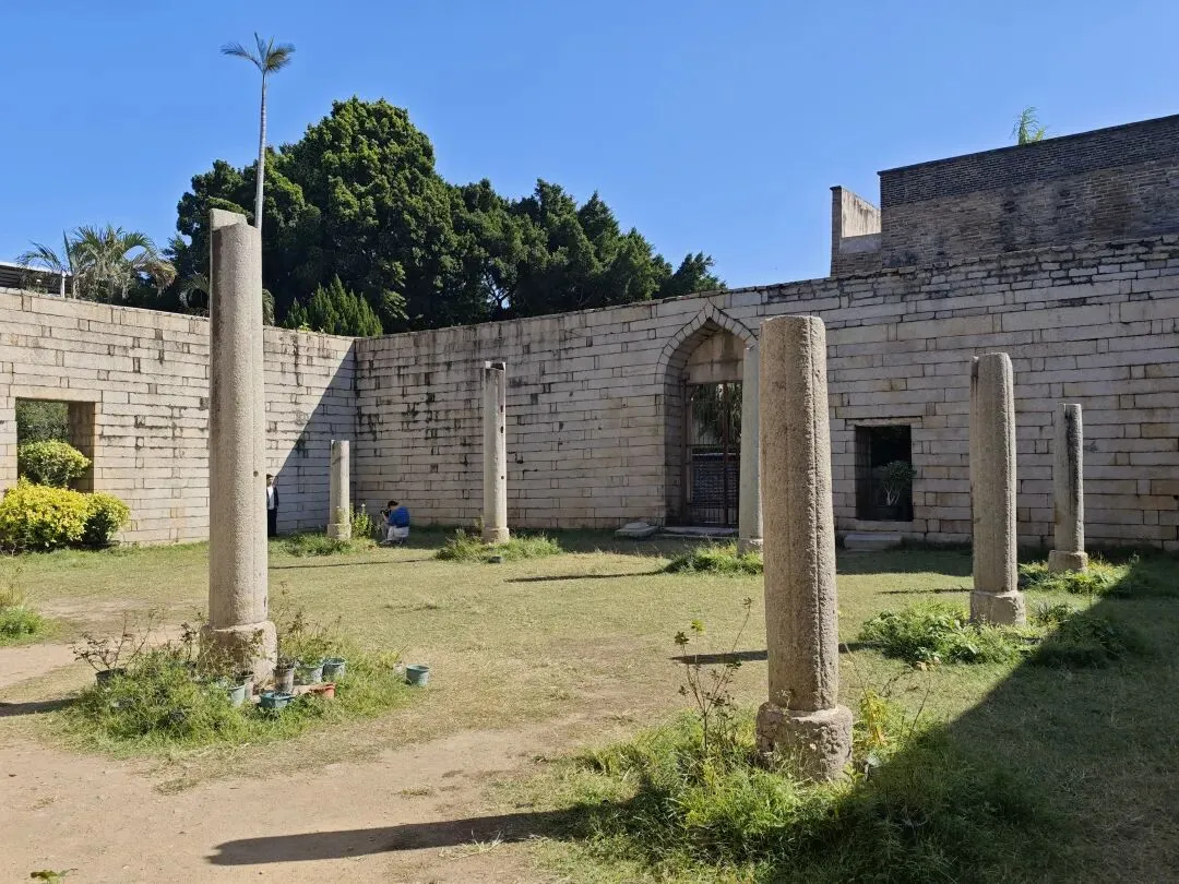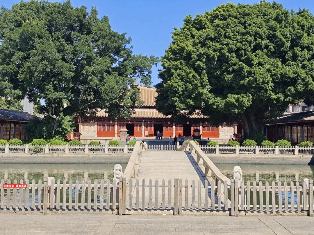 奉天坛是与门楼相联的礼拜大殿,也是穆斯林礼拜的地方,占地面积约600平方米。奉天坛坐西朝东,西墙为朝向伊斯兰圣地麦加的正向墙,墙上有六个小壁龛、四座长方形门和一座雕刻阿拉伯文《古兰经》的巨大尖弓宝盖状壁龛“米哈拉布”。坛正面为一尖拱形大壁龛,左右各辟一门,东墙辟一尖拱形大门,南墙开八个长方形大窗,北墙开一门。其屋顶原为巨大的圆顶,于明万历年间地震中坍圮,现仅存花岗岩石砌成的大殿四壁和巨大的尖顶窗户。因为清真寺面积不大,所以很快就逛完了。下一站是,文庙。文庙,是古时候泉州的官方纪念和祭祀孔子的场所,也是最高等级教育机构,儒学的传播中心。西侧文庙组群有棂星门遗址、大成门、泮池、泮桥和大成殿等建筑;东侧学宫组群包括照壁、育英门、学池、学桥、东西书斋、明伦堂等。文庄蔡公祠,是为了祭祀明代理学家蔡清而建。蔡清为晋江县曾井铺人,卒赠礼部右侍郎,谥号“文庄”。他一生致力理学研究,继承和发展了朱熹学说,是明代著名理学家、教育家。