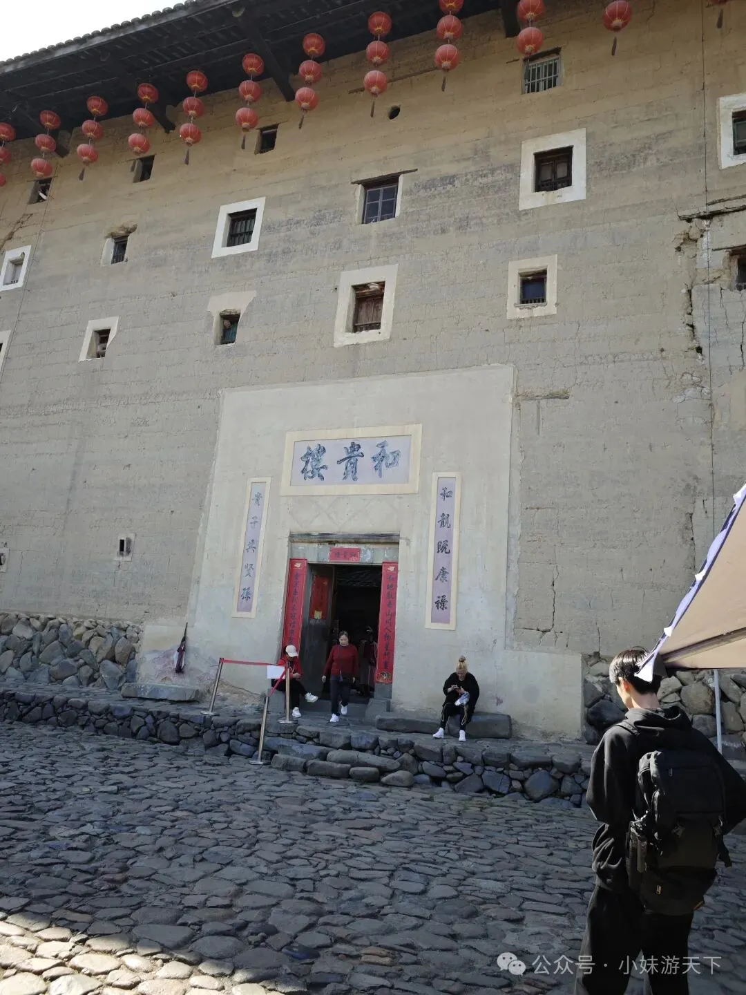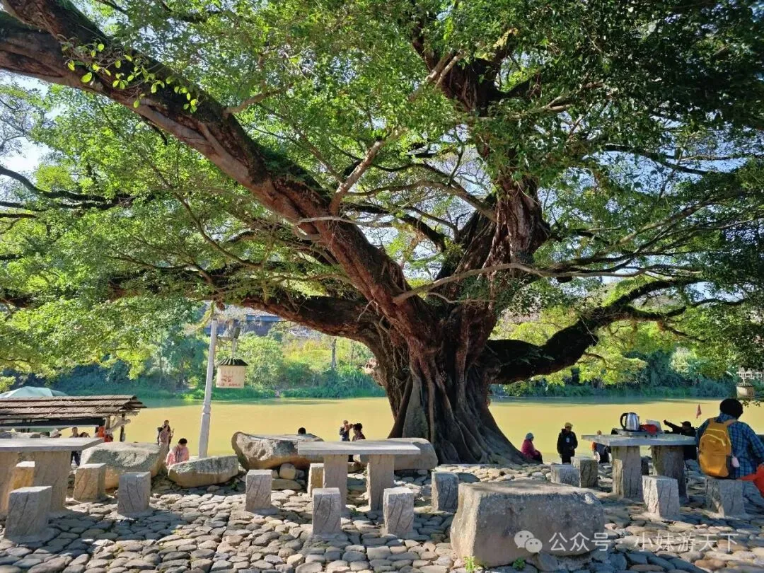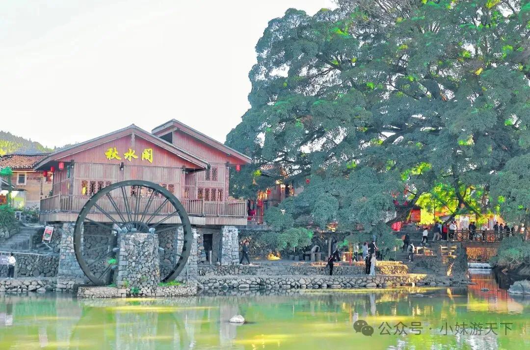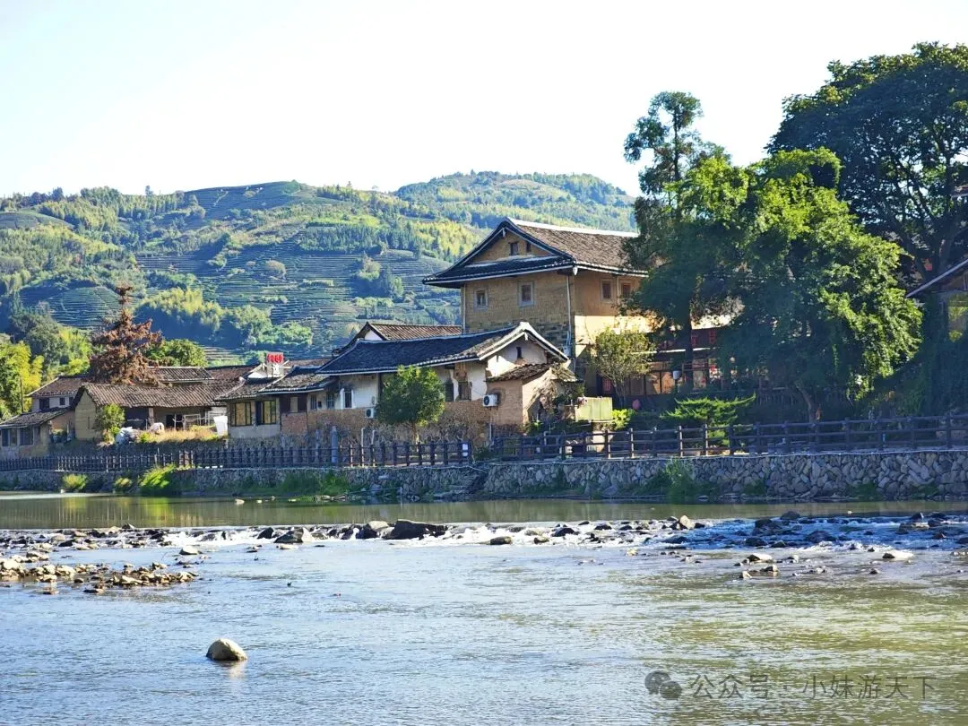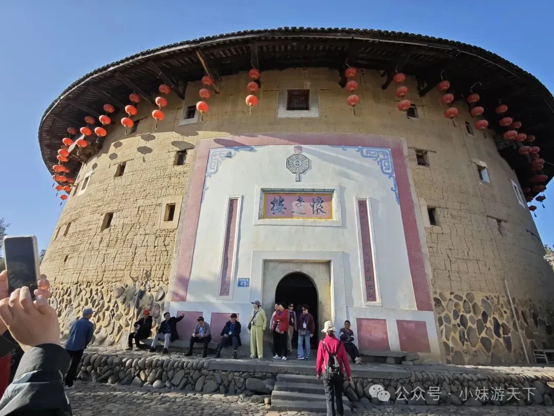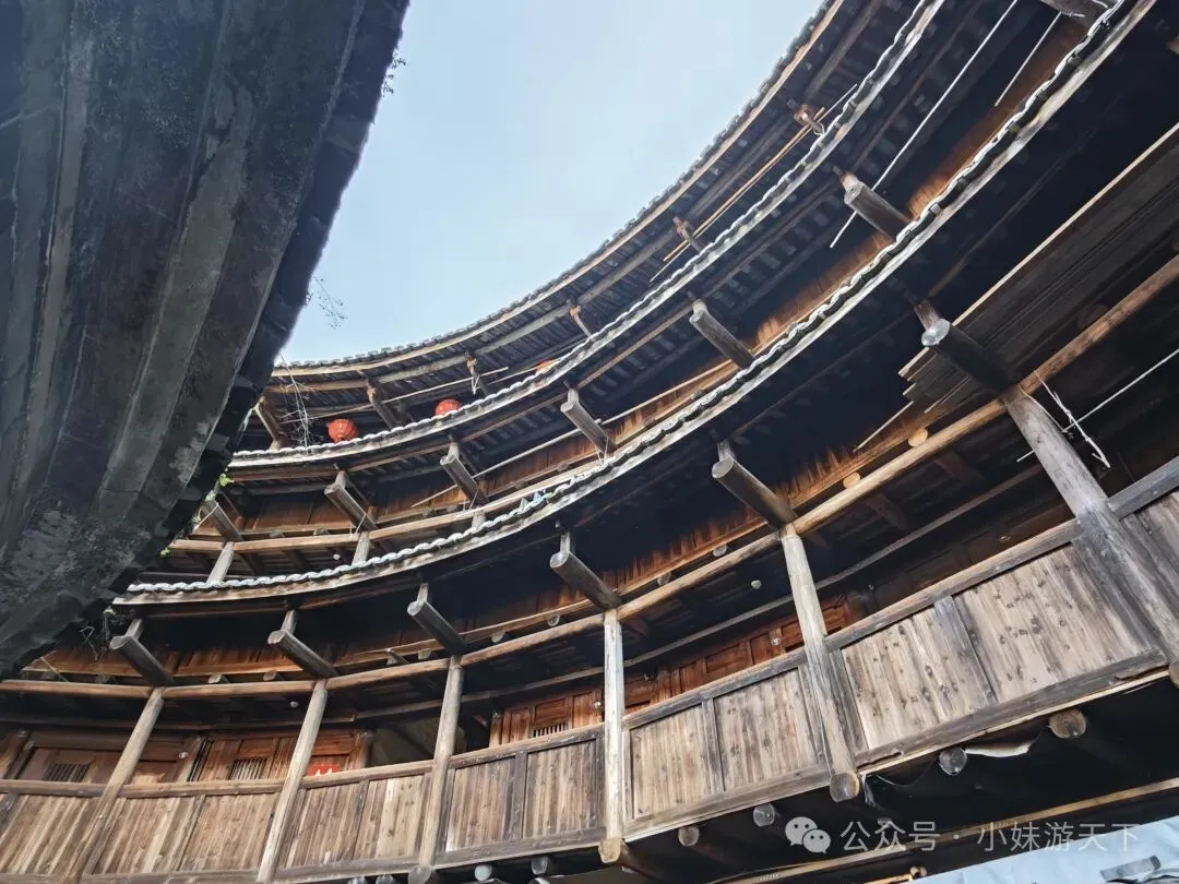 这是一盘看上去平平无奇的汤,没想到竟然是全场最佳。苦瓜不苦,加上白贝味道却很鲜美,还有回甘。晚饭后又是走路回酒店。因为开局不利,出门第一天就感冒,路上还得买个感冒药。随机走进一家药店,小姐姐就叫我扫会员,说是会立减,然后又送了我一瓶活络油。我选了肉片清汤面加一份油条,不知道什么时候开始爱上了吃油条。新一天的行程,我们决定去云水谣。但是距离较远,公共交通转来转去不方便,于是,我们决定租了辆车自驾。进去云水谣景区后,就是近处有农田,远处有高山的情景。整了云水谣景区有三座客家土楼,下面这个是是路线上的第一座,和贵楼。和贵楼始建于1732年,坐西朝东,是利用悬浮原理,以松木为桩基、筏基,在3000平方米的沼泽地上建起的方形土楼,被称为“天下第一奇”。采用内廊式土木结构,共有五层,每层有24个房间,房间对称分布,围合成一个长方形的内院,院中有一座私塾,是云水谣中最高的方形土楼。福建盛产茶叶,所以在云水谣里面,最常见的特产就是茶叶,而且种类也很多。这里的土楼跟别处的土楼还有点不一样,这里的土楼上楼参观是需要付费的。差别可能就是,这里的土楼到目前仍是有人居住的。从和贵楼参观出来已是中午,正好吃午饭。路过一个当地居民开的小饭馆,进去尝尝地方的特色菜。老板说可以带我们用便宜价格参观土楼,不过我们最后还是没去。据说整个云水谣里面一共有十三株百年老榕树,是福建省内最高、最大、最集中的百年榕树群。其中有一株被称为“八闽第一榕”的古榕树,树丫枝长度达30多米,树冠覆盖面积近2000平方米,树干底部需10多个大人合抱围住。榕树群与蜿蜒的长教溪、古老的鹅卵石栈道相互映衬,构成了一幅如诗如画的田园风光。在水车旁有两棵经历百年风雨相互依偎的榕树,被当地人称为“夫妻树”,象征着白头偕老。怀远楼始建于1905年,占地面积为190平方米,是内通廊式的圆楼建筑,也是保存最完好的双圆环形土楼。共有四层,每层有34个房间,在围合而成的内庭中央有个私塾,现在变成了各种小商店。下一个土楼就是德庆楼,忘了什么原因没有留下照片。土楼大致都是这个模式,不同的土楼之间又会有各自的个性风格。就不探究竟了。