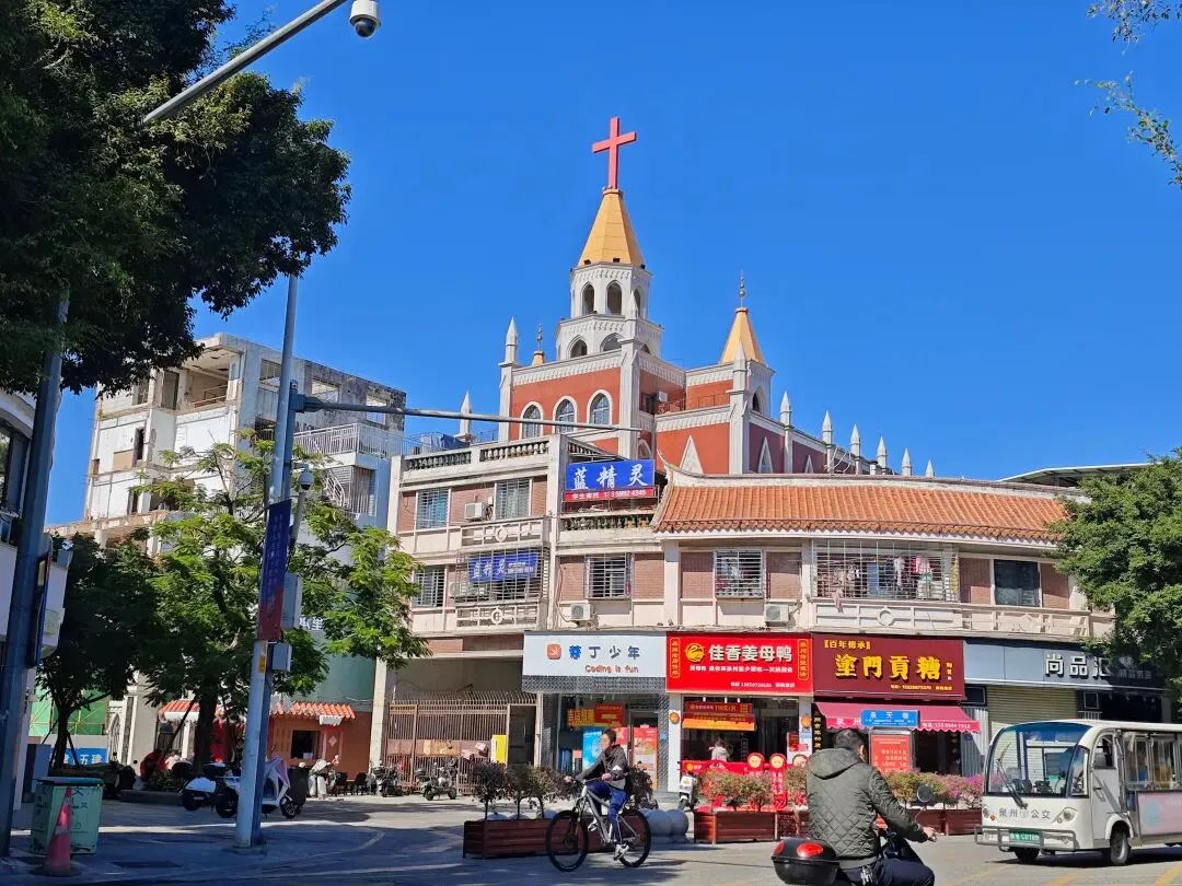它是泉州第一座基督教堂,始建于1863年,建筑融合了哥特式风格与闽南骑楼特色,钟楼的尖顶、金色塔顶搭配红色十字架是其显著外观特征。