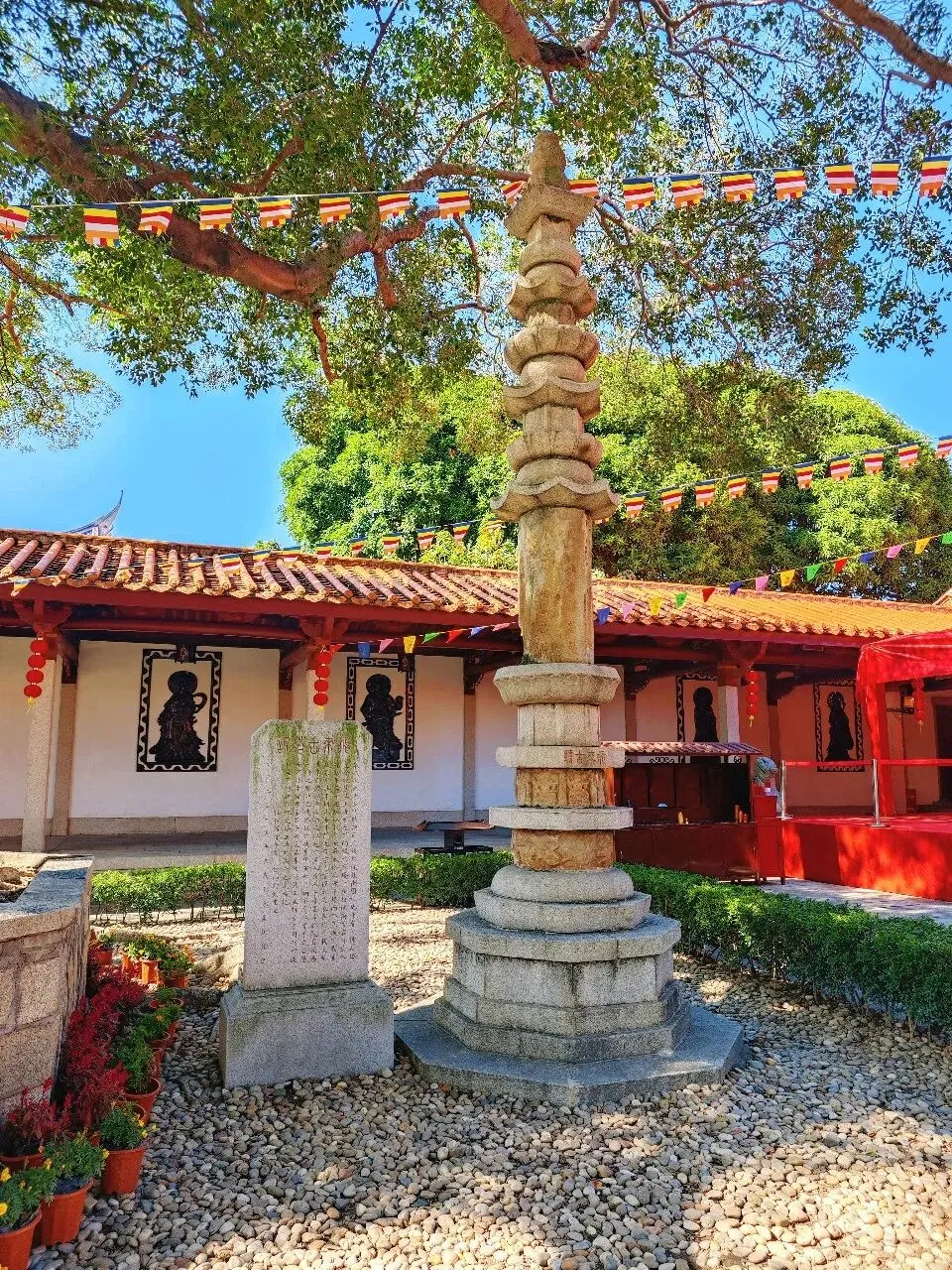 承天寺又称月台寺,与崇福寺、开元寺并称为泉州“三大丛林”。始建于南唐保大十五年至中兴元年(957-958年),初名南禅寺。北宋景德四年(1007年)敕名承天寺。明末毁于兵乱,清康熙三十年(1691年)重建。承天寺是弘一法师最主要的驻锡之地,他在此创办月台佛学研究社,宣讲律学要略,整理藏经阁典籍。1942年弘一法师圆寂后,灵龛移至承天寺安座,寺内有其火化处纪念碑等纪念标识。大悲殿