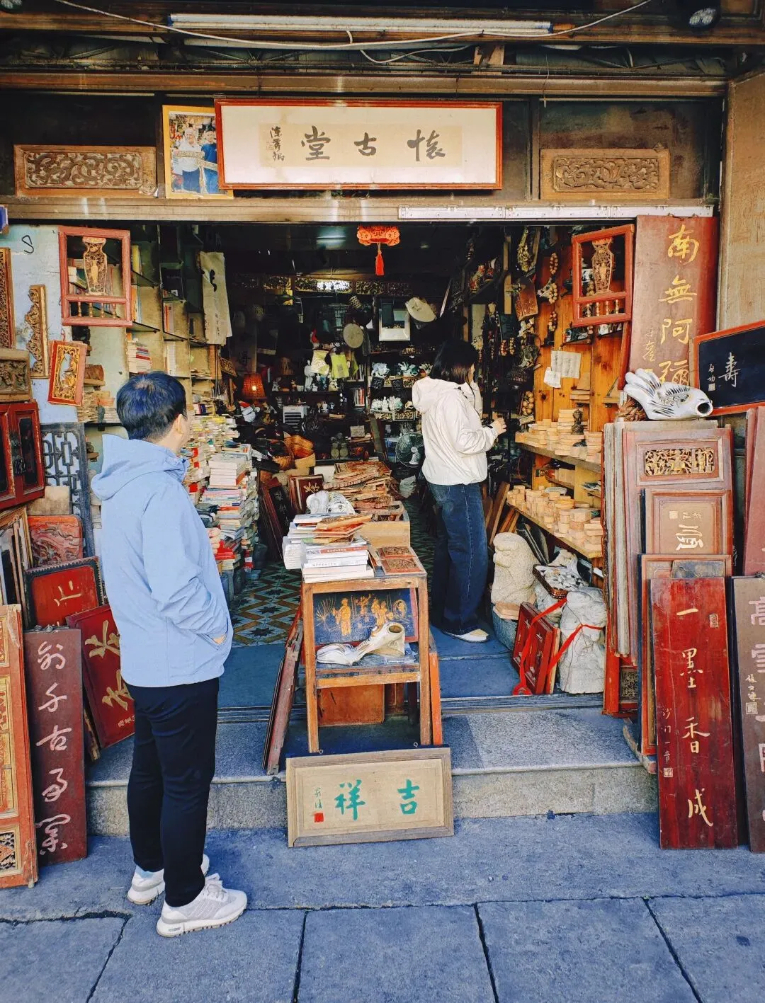 初到旅舍,打开窗户就发现后巷有一个小店铺在门口打包鞋子,鞋盒摆满一地,特别是那个蓝绿色的盒子。一开始还以为他在卖假货。