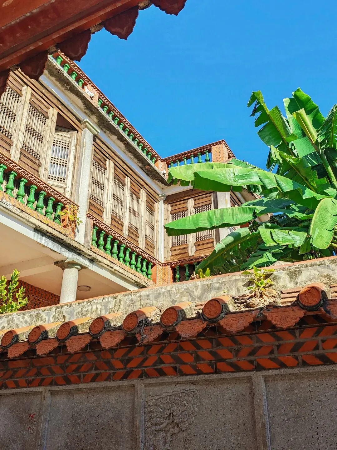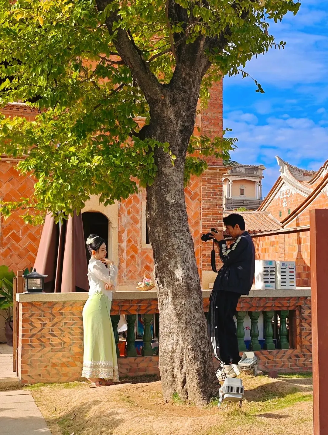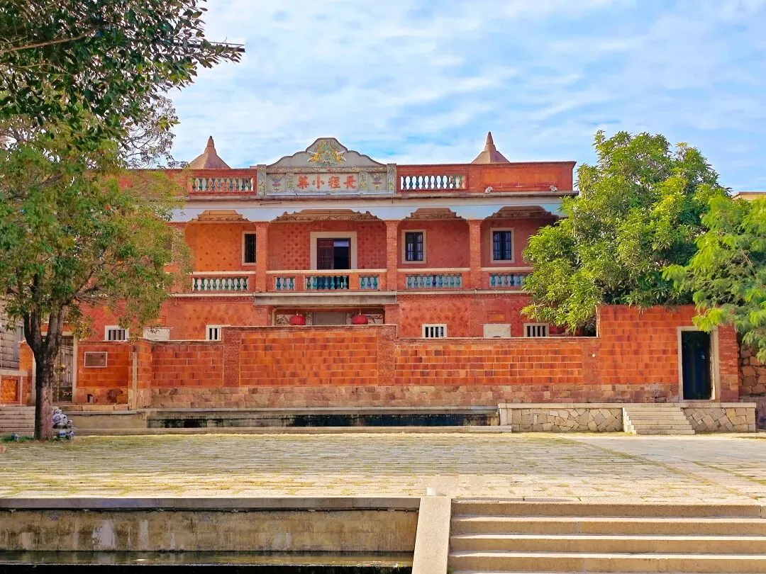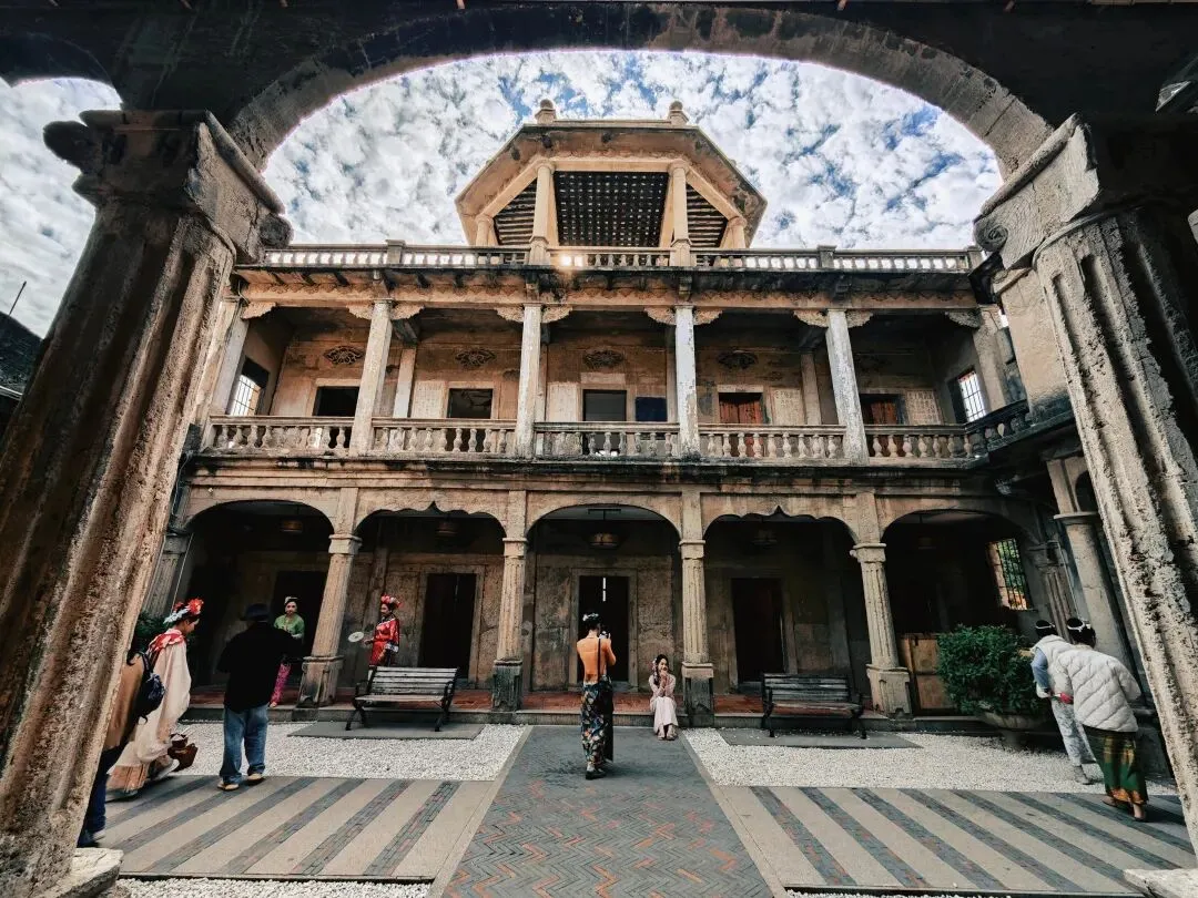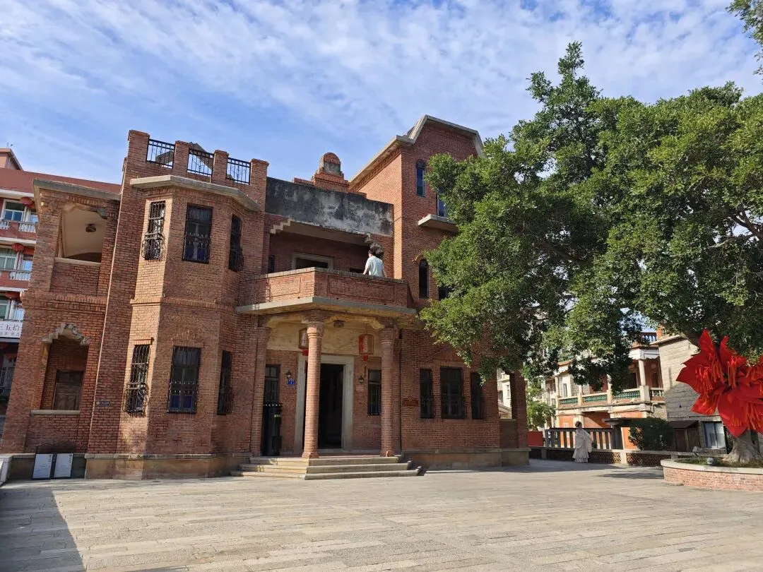 太夸张了,整个蟳蜅村都长满了簪花的小姐姐。在拍照的那一个小时里面,就知道村里有座庙,都没有好好逛逛这个村子。然后就匆匆离开了。接下来的行程,我们去了番仔楼。所谓番仔楼,是闽南人对民国时期南洋归侨所建的中西合璧洋楼的称呼。这次我们所到的番仔楼,位于泉州晋江市新塘街道梧林社区,是清末—民国南洋华侨返乡建造的中西合璧洋楼集群。全村现存60+栋百年番仔楼,建筑多为上世纪初至抗战前修建,普遍是闽南红砖基座+罗马柱、拱券、南洋花砖等西洋/南洋元素,背后是华侨乡愁与爱国故事 。